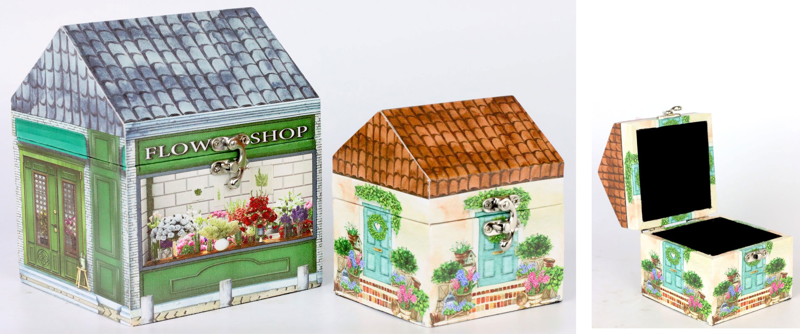 - **Design & Konzept:** Zwei Schachteln im stilvollen Haus-Motiv aus Holz, Größen 12 cm und 17 cm.