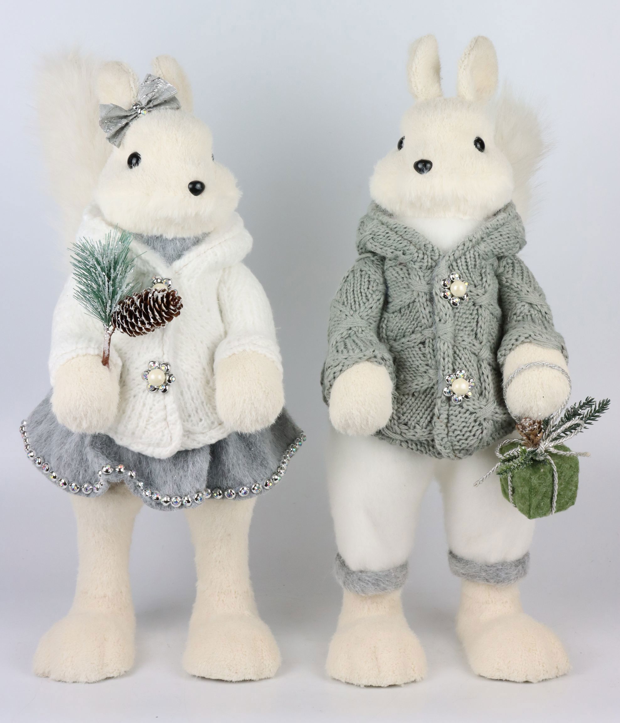 Verleihen Sie Ihrem Sortiment in der Weihnachtszeit einen Hauch von winterlicher Magie mit unserem zauberhaften Eichhörnchen "Frosty Tails" Set. Dieses zweiteilige Set, bestehend aus einem Paar frostiger Eichhörnchen, bietet die perfekte Ergänzung für jede weihnachtliche Dekoration im Einzelhandel. Die in eleganten Grau- und Weißtönen gehaltenen Tiere strahlen eine edle und zugleich verspielte Eleganz aus, die in jeder Umgebung ein festliches Highlight setzt.