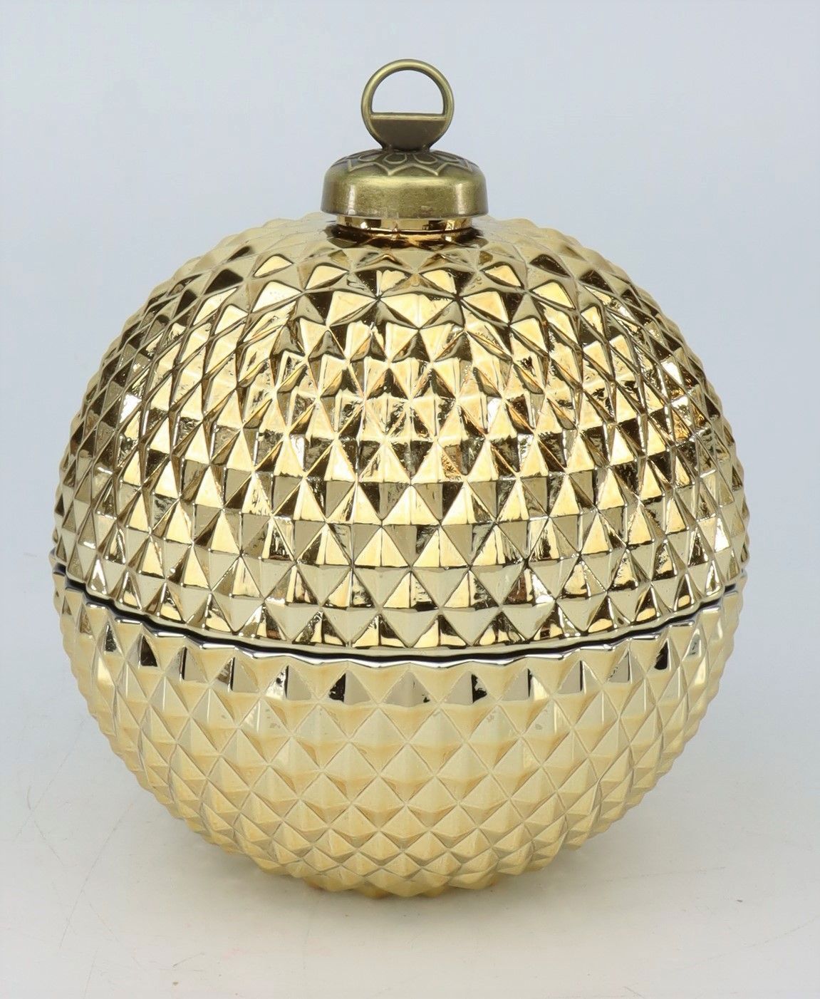 DEErleben Sie das besondere Flair der Weihnachtszeit mit unserer Glasdose "Christmasball". Der sorgfältig verarbeitete Weihnachtsanhänger mit der Artikelnummer 6675 besticht durch seine prächtige goldene Farbe und die raffinierte Form einer Weihnachtskugel. Mit den Abmessungen von ca. 11 cm ist die Glasdose "Christmasball" ein wahrhaft eleganter Eye-Catcher an Ihrem Weihnachtsbaum.