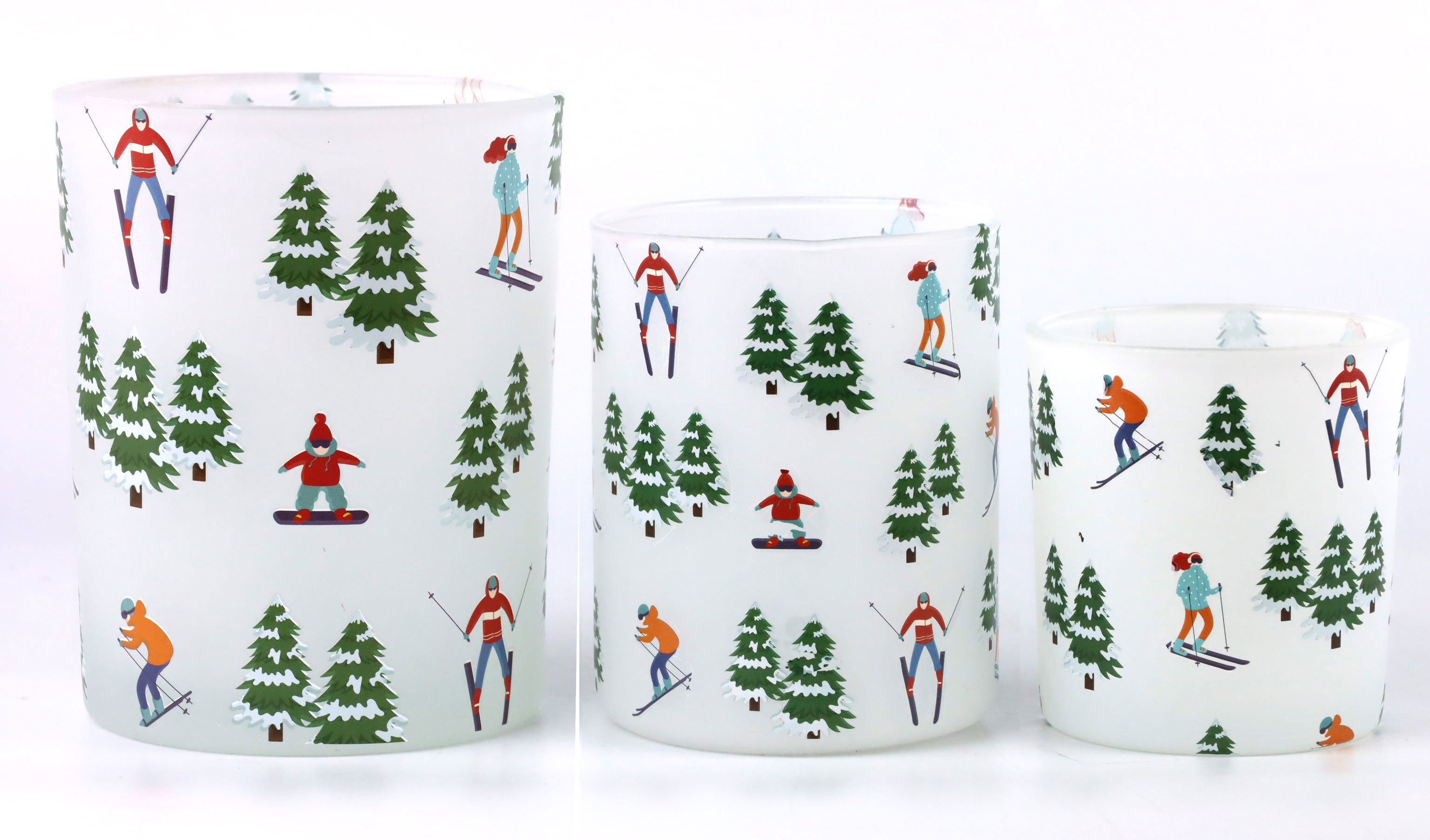 Die Skifahrer-Motive vermitteln ein Gefühl von Abenteuer und Freiheit, das perfekt zur kalten Jahreszeit passt. Ob für festliche Anlässe oder als stimmungsvolle Dekoration im Ladengeschäft – mit unseren Windlichtern "Snowy Escapades" schaffen Sie stets eine einladende und warme Atmosphäre. Platzieren Sie sie auf Regalen, Tischen oder Fensterbänken und verzaubern Sie Ihre Kunden mit dem winterlichen Charme dieser einzigartigen Wohnaccessoires.