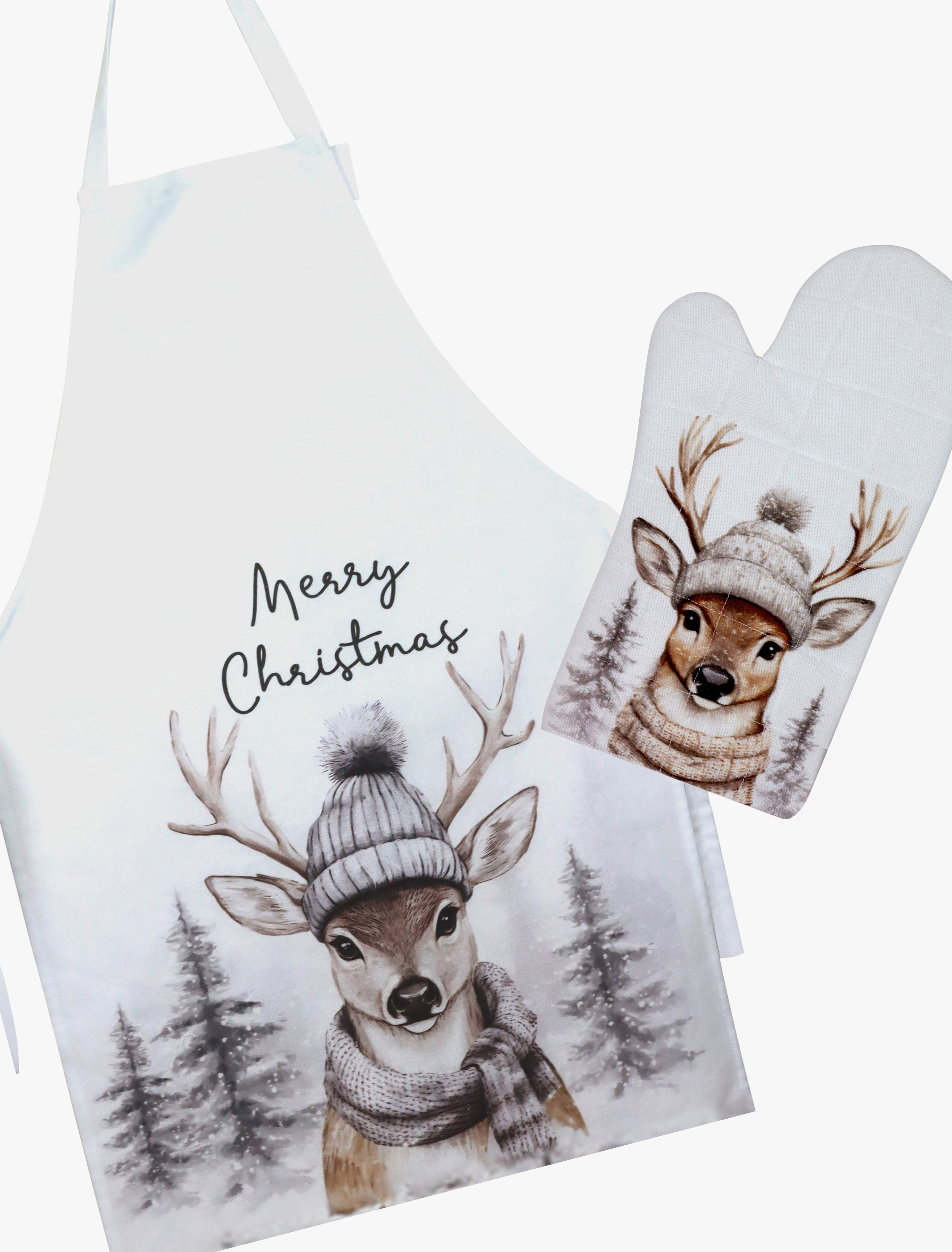 Mit diesem Set sind Ihre Kunden bestens ausgerüstet, um in der Küche zu glänzen. Ob beim Plätzchenbacken mit der Familie oder beim Vorbereiten des Festmahls – die Schürze schützt vor unerwünschten Flecken, während der Topfhalter zuverlässigen Schutz vor Hitze bietet. Dank des winterlichen Hirschdesigns wird jeder Handgriff in der Küche zu einem festlichen Erlebnis.