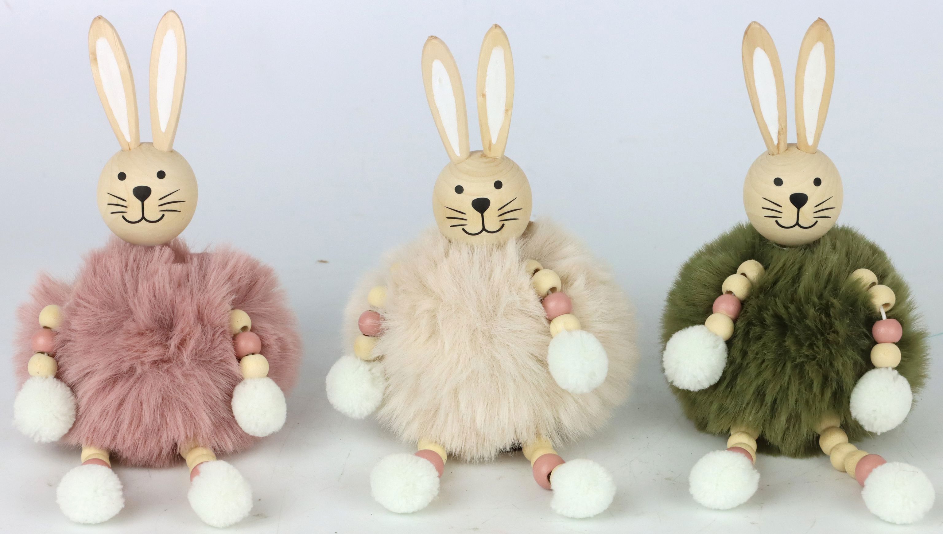 Bereiten Sie sich und Ihren Kunden auf eine bezaubernde Osterzeit vor mit unserem dreiteiligen Set "HASEN FLUFFY". Diese charmanten Dekohasen vereinen Stil und Gemütlichkeit und bringen den Frühlingszauber direkt in Ihr Geschäft. Jedes Set besteht aus drei individuellen Hasenfiguren in verschiedenen Positionen, die aus hochwertigem Kunstfell und robustem Holz gefertigt sind. Mit einer Größe von etwa 15 cm fügen sich diese niedlichen Dekorationsobjekte nahtlos in jede Umgebung ein und eignen sich hervorragend zur kreativen Gestaltung von Tischdekorationen oder zur Versüßung des Schaufensters.