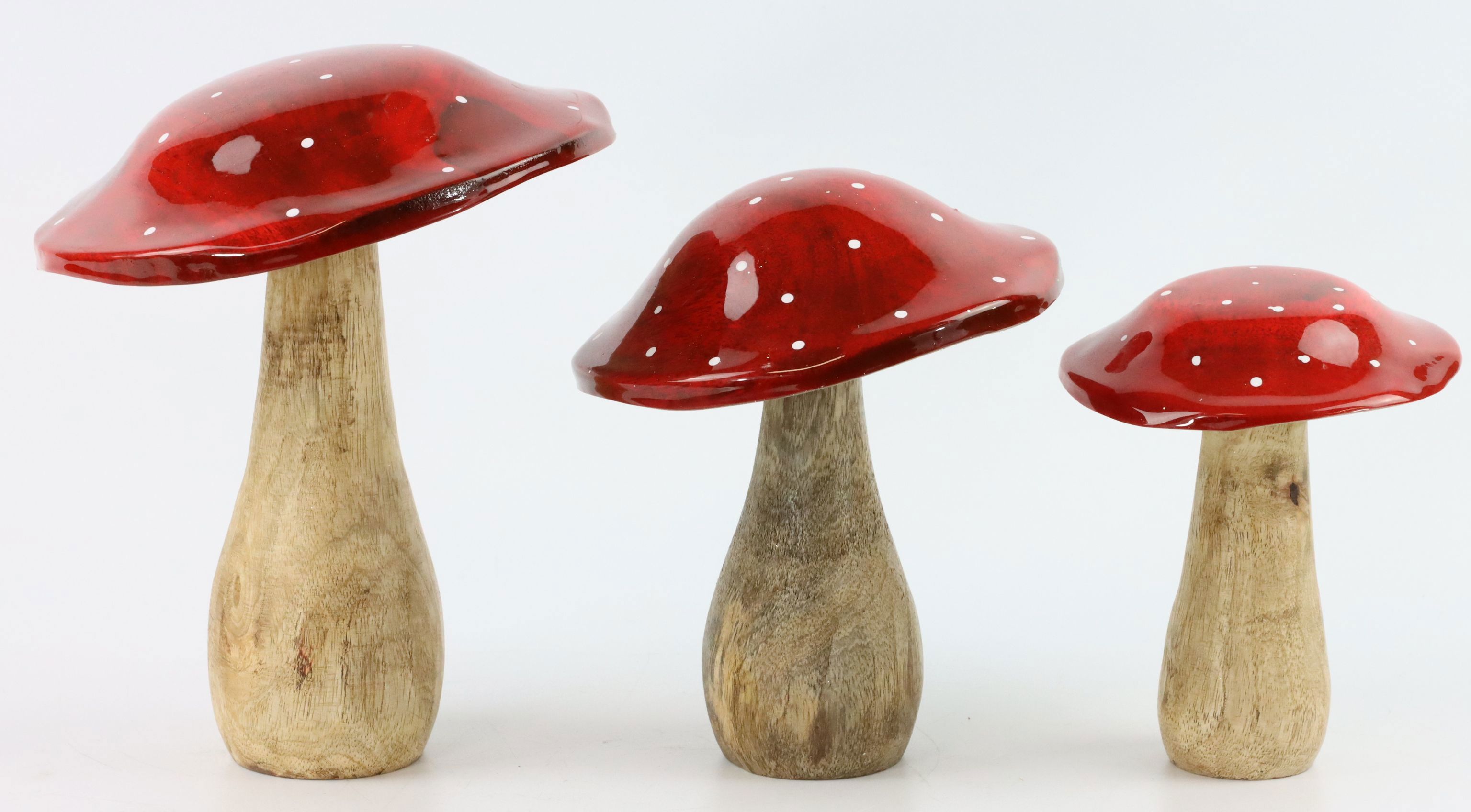 DELassen Sie Ihren Einzelhandel mit der besonderen Dekoration unserer Fliegenpilze aus Mangoholz (Artikelnummer 1166) aus unserem Online-Shop zur Wohn- und Lifestylewelt aufblühen. Dieses dreiteilige Set ist perfekt zur Verschönerung jeder Umgebung und stellt eine ideale Ergänzung für Ihre herbstlichen und winterlichen Wohnaccessoires dar.