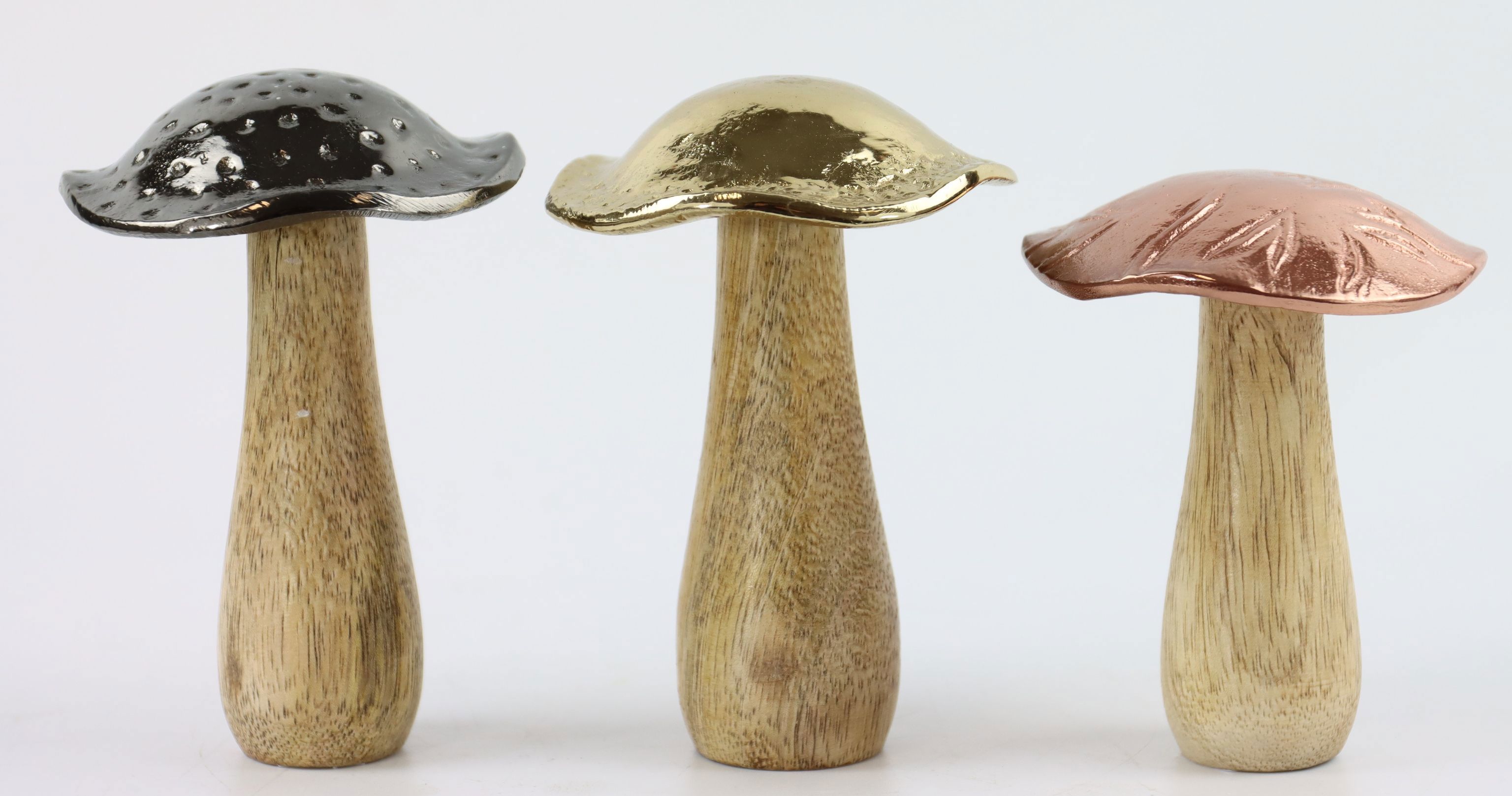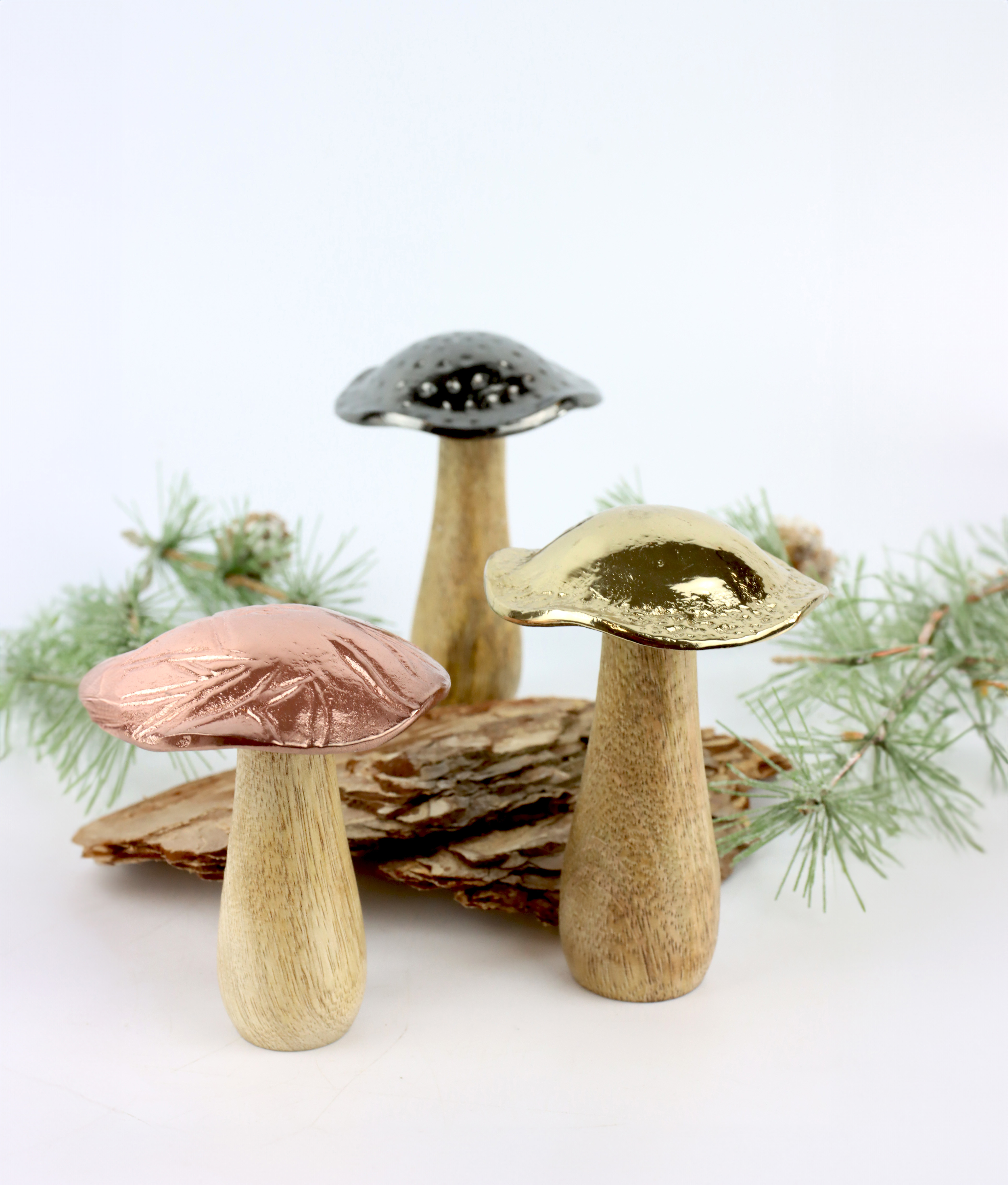 SEO-relevante Keywords: Dekopilze ZAUBERWALD; 3-teiliges Dekopilz Set; Artikelnummer 8560; Herbst- und Winter-Dekoration; Aluminium und Holz Dekoration; Wohnen und Lifestyle Produkt; Natürliche Tischdekoration.