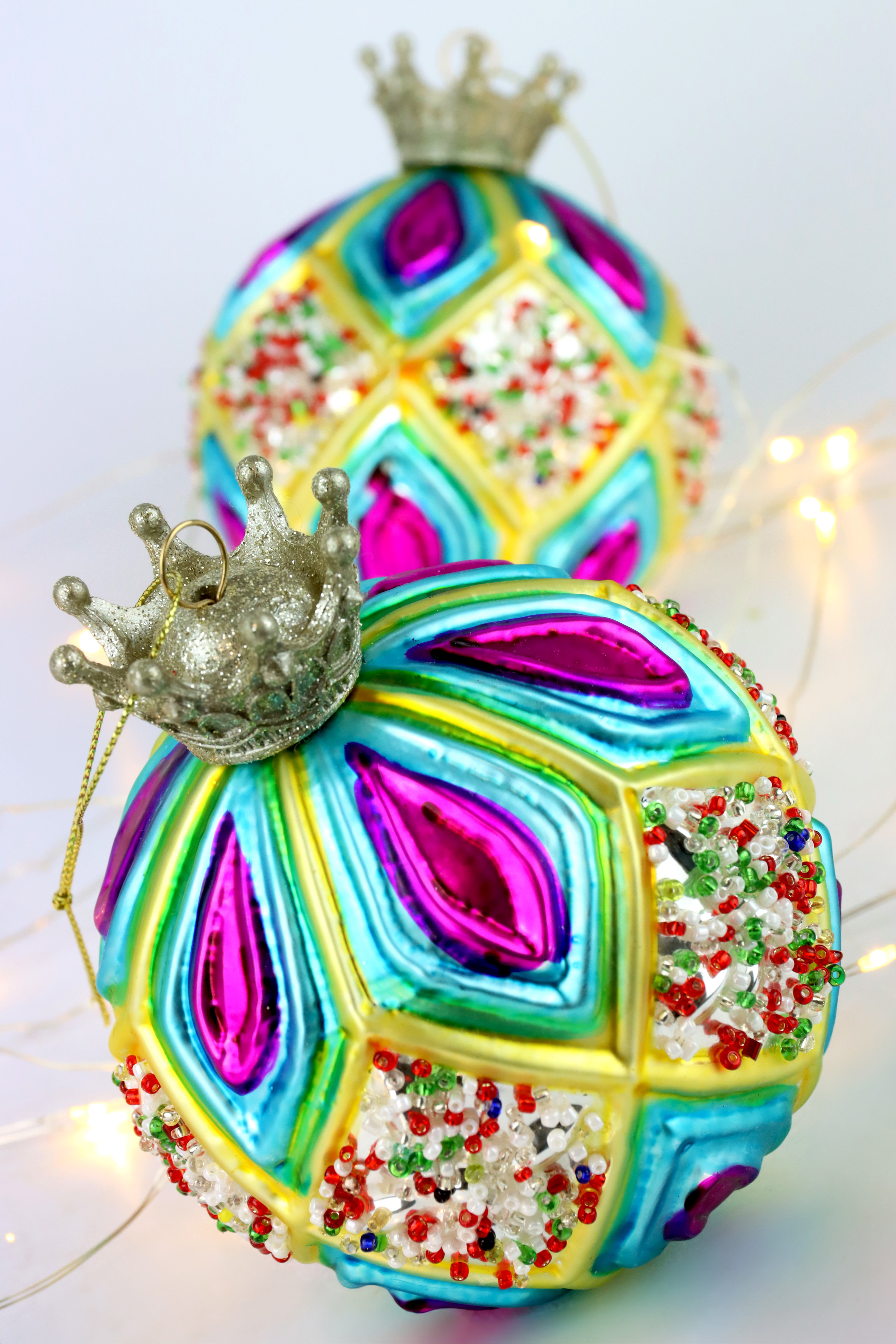 DEErhellen Sie Ihre Weihnachtsdekoration mit unserem exquisiten Set "Fancy Crown" Glaskugeln! Mit der Artikelnummer 7806 wird dieses Set mit 6 bunten Glaskugeln inklusive einer eleganten Krone zum leuchtenden Highlight für die festliche Saison.