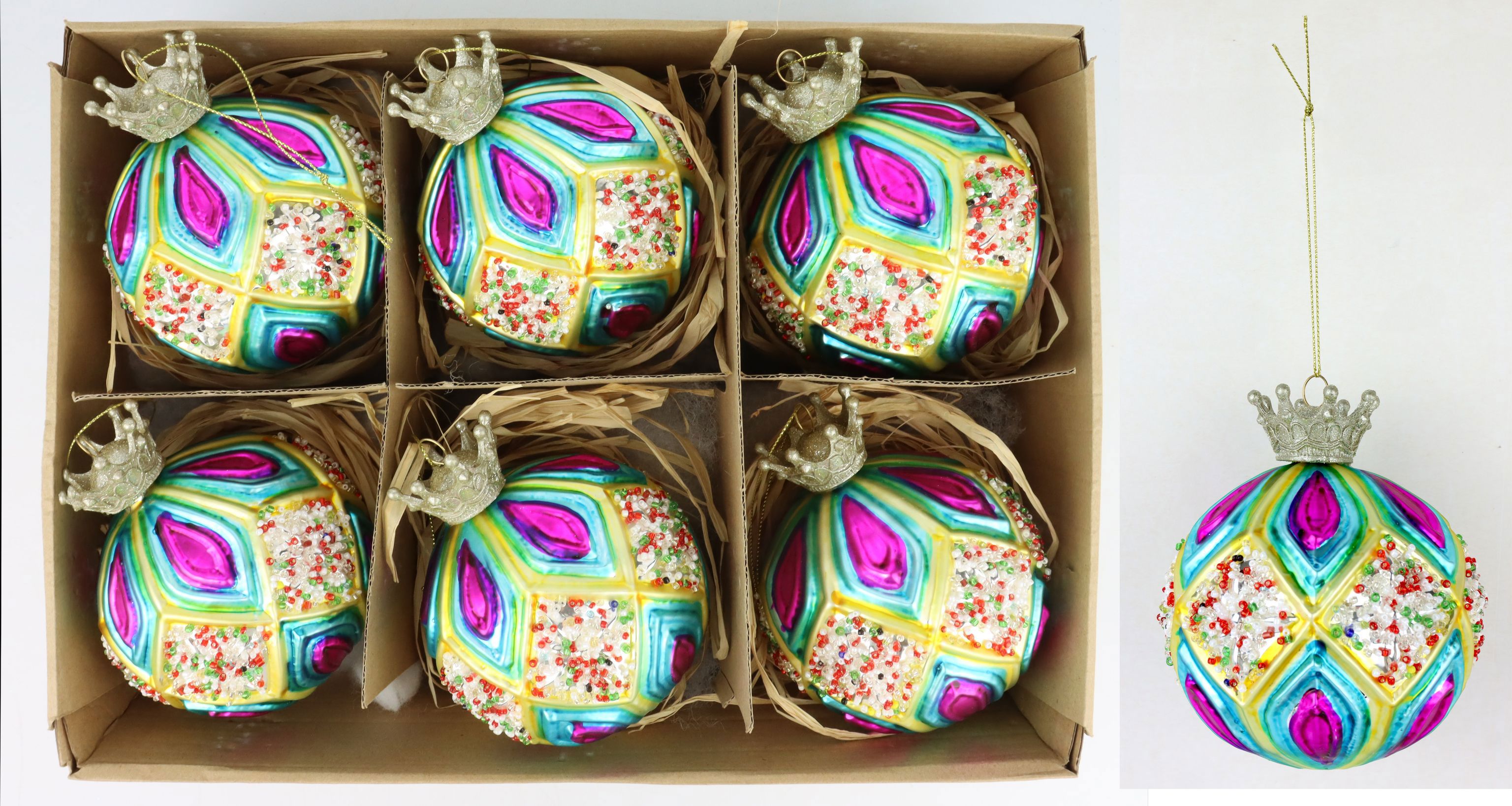 Verwandeln Sie Ihren Weihnachtsdekobedarf mit unseren atemberaubenden "Fancy Crown" Glaskugeln. Dieses 6-teilige Set ist eine bedeutende Ergänzung für jedes Sortiment an Weihnachtsdekorationen und verleiht dem Einzelhandel eine noch größere Auswahl an attraktiven Optionen.