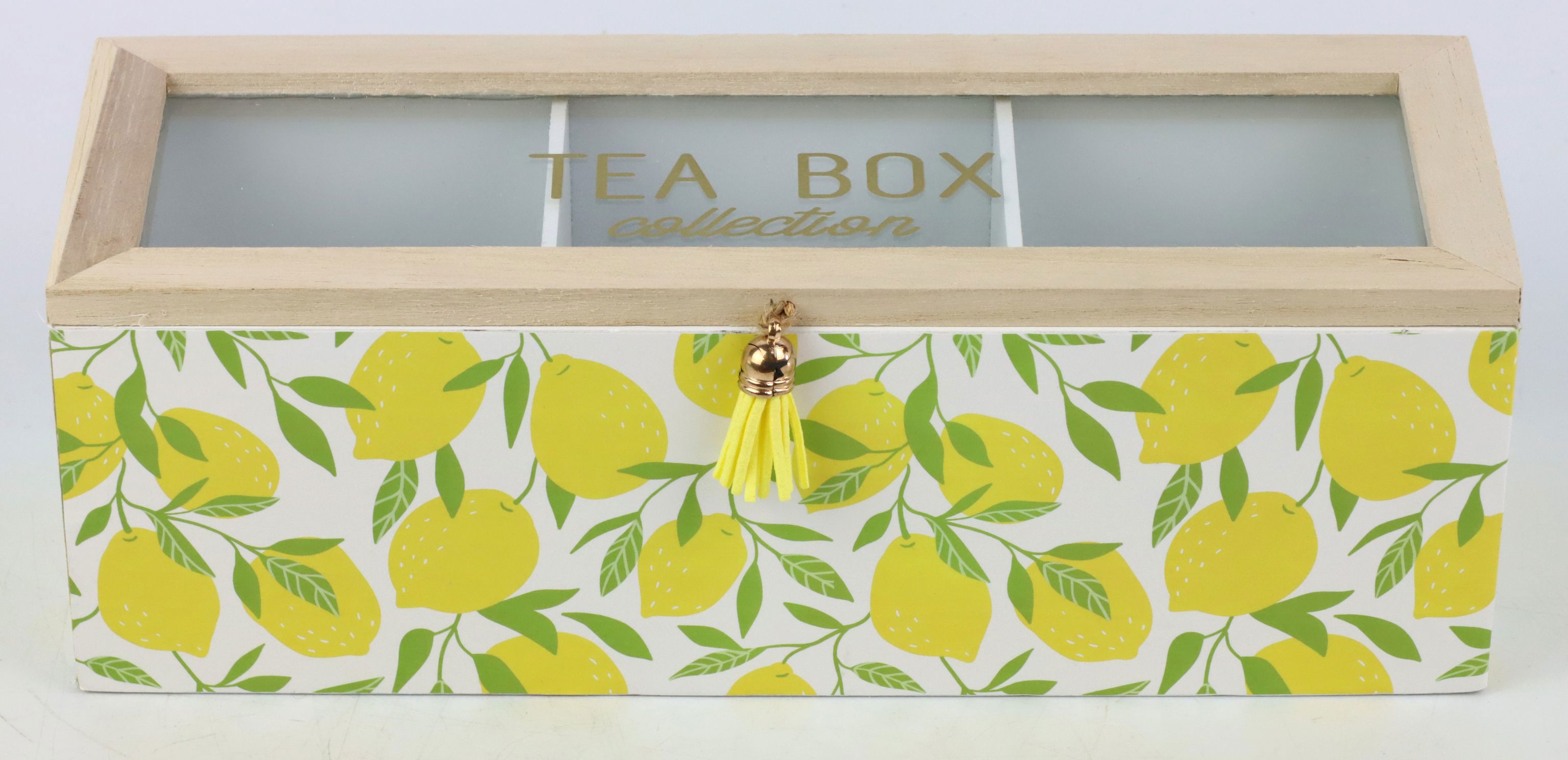 Made of high-quality wood and fine glass, the "LUCKY LEMON" TEEBOX brings freshness and elegance to your shop or café. With a generous size of around 28 cm, it fits perfectly on any shelf or in any display case without taking up too much space. The spring-like lemon motif on the surface lightens up the design and exudes a touch of summer and good humour. This tea box is therefore not only a practical storage place, but also a real eye-catcher in your shop.