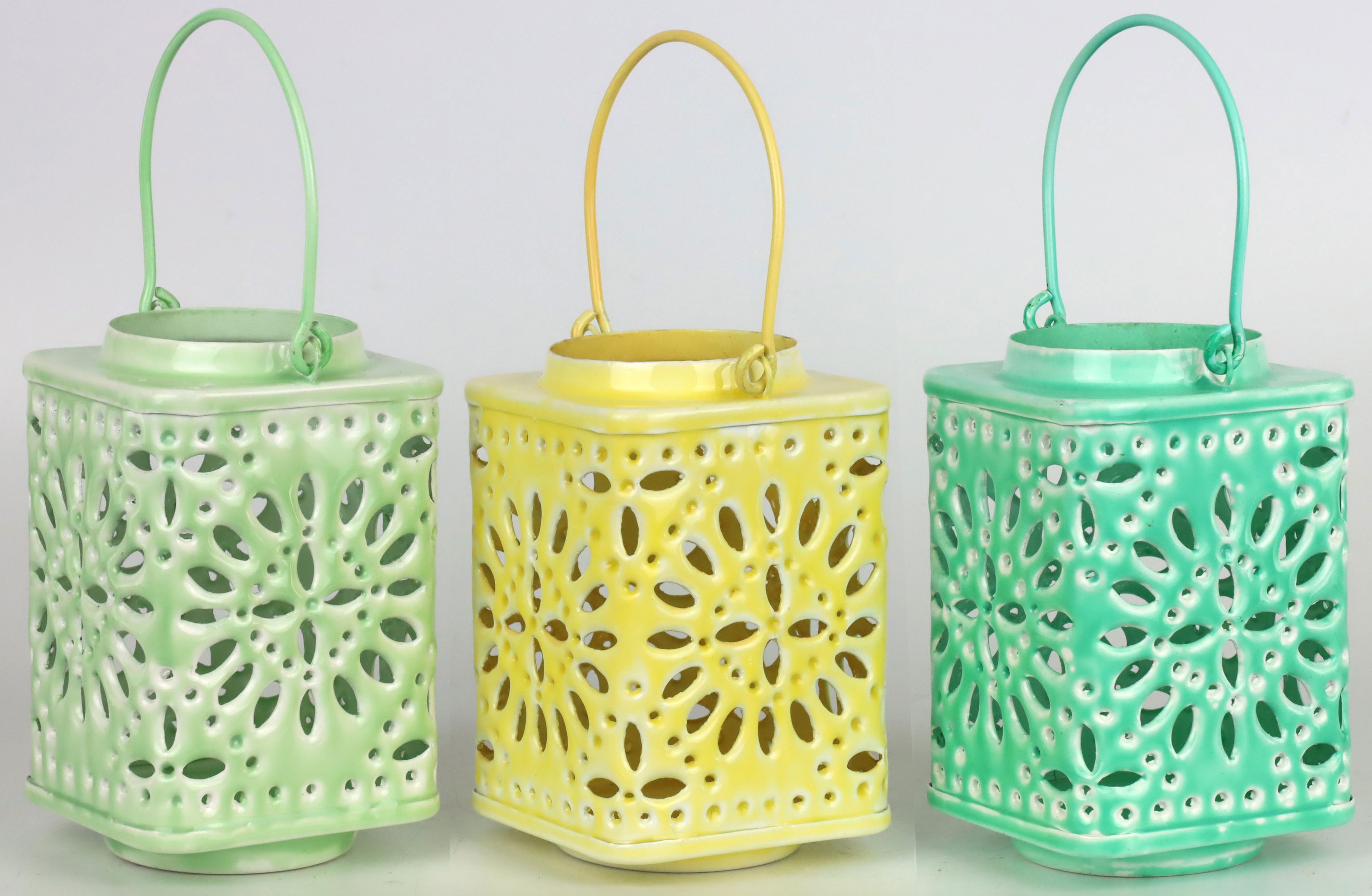 Discover the enchanting set of three lanterns "TROPEA", a must-have for the spring/summer season for stationary retail in the home and lifestyle sector. This exquisite lantern set adds a touch of colour and stylish design to any indoor or outdoor setting. Crafted from sturdy iron and finished in vibrant green and yellow, these lanterns are not only a functional lighting piece but also a decorative highlight in any room.
