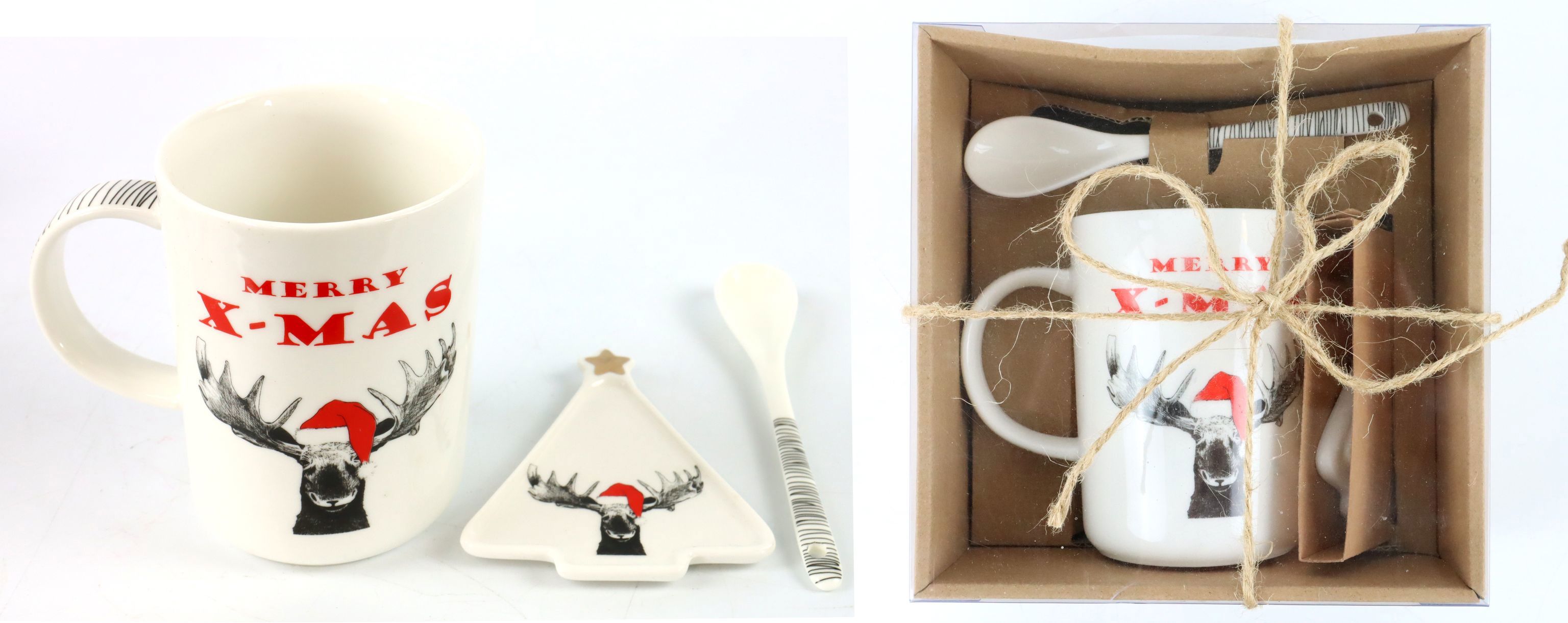 Discover our charming gift set "Funny Moose" S/3, an ideal product for stationary retail in the home and lifestyle sector. This three-piece set embodies pure Christmas cheer and consists of a mug, a Christmas tree plate and a spoon, all skilfully crafted from high-quality porcelain. The adorable Christmas elk motifs give this set its special charm, which will delight your customers at Christmas time.