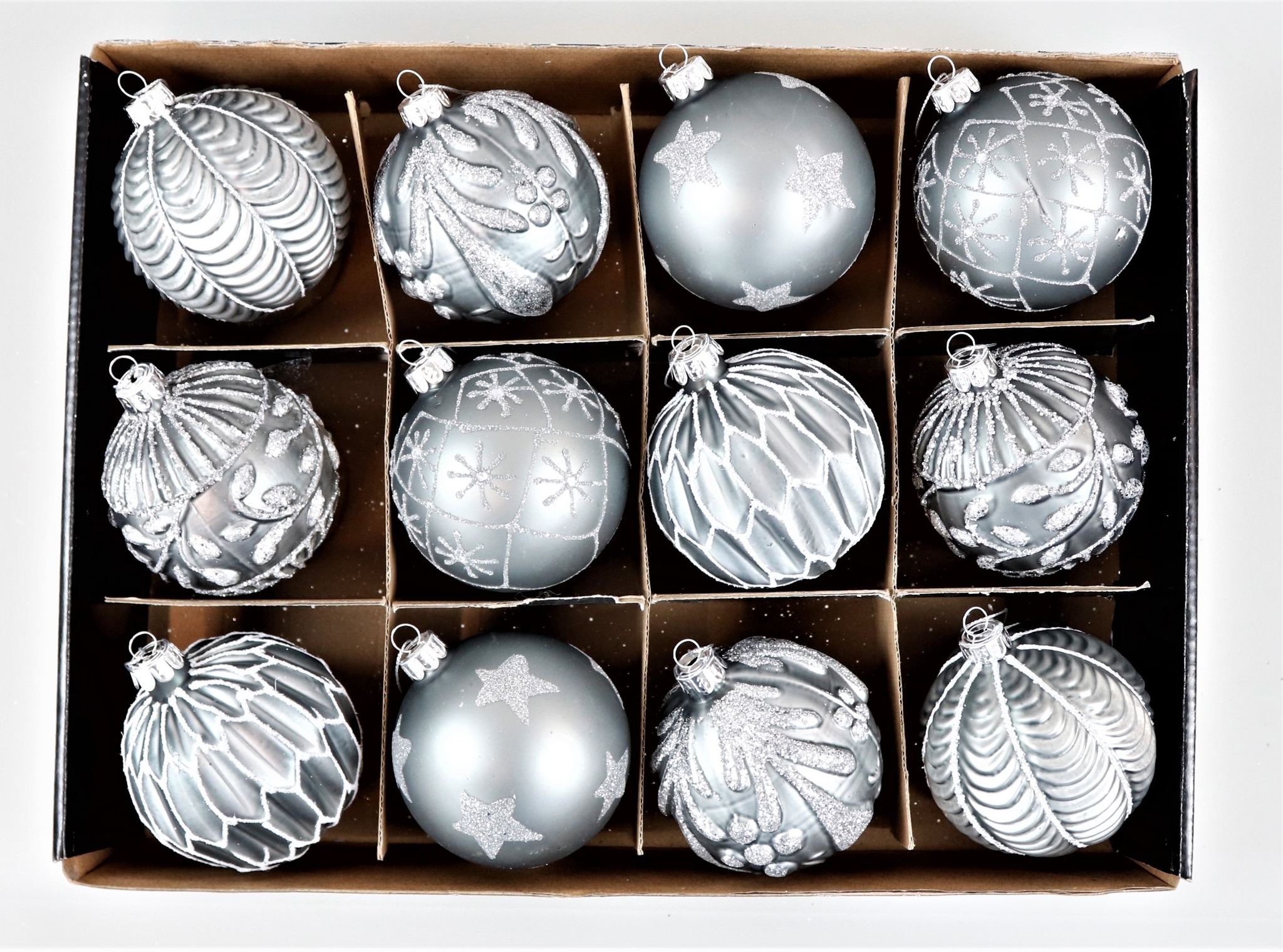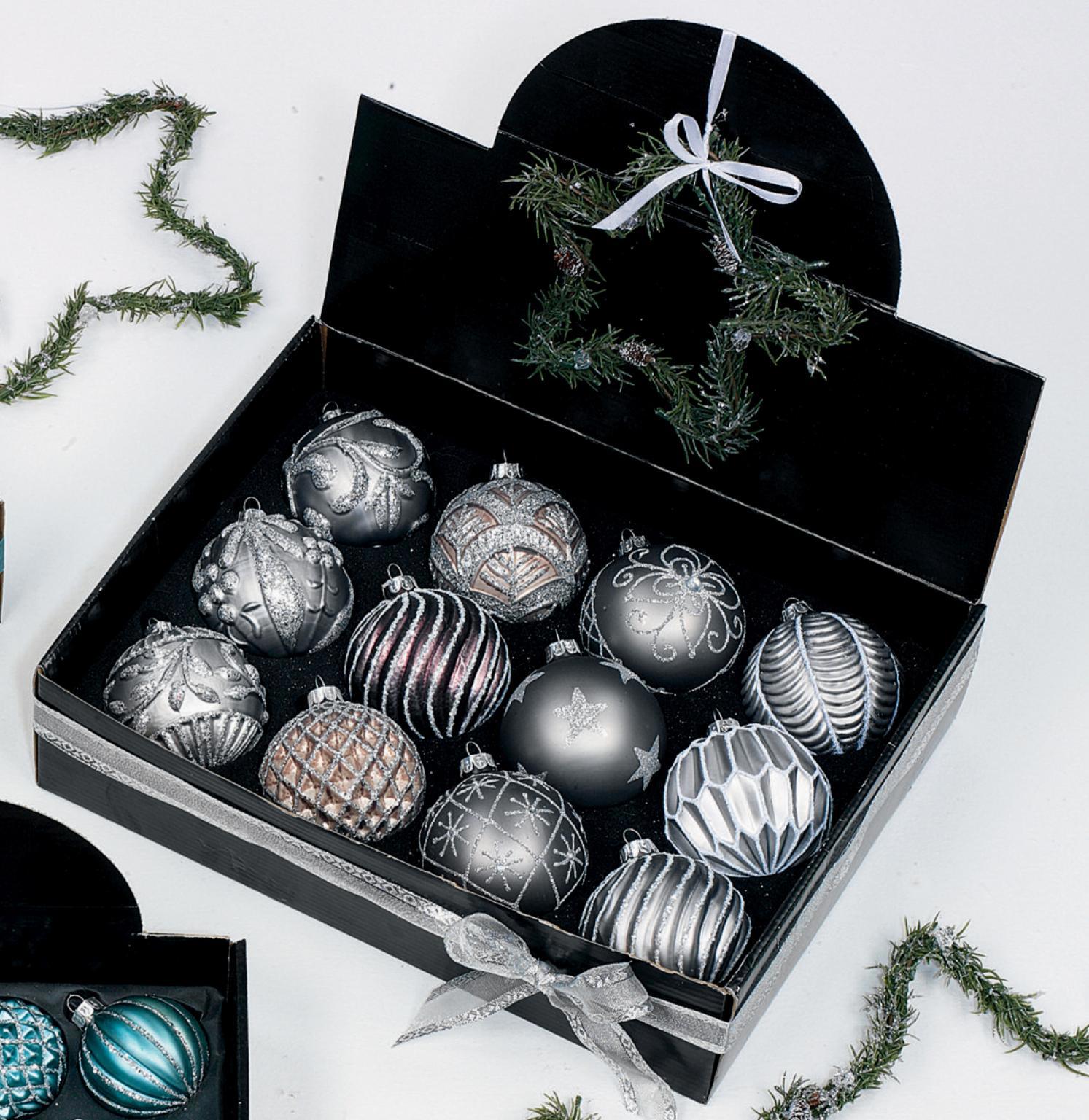 - Elegant set of 12 glittering glass baubles in silver.