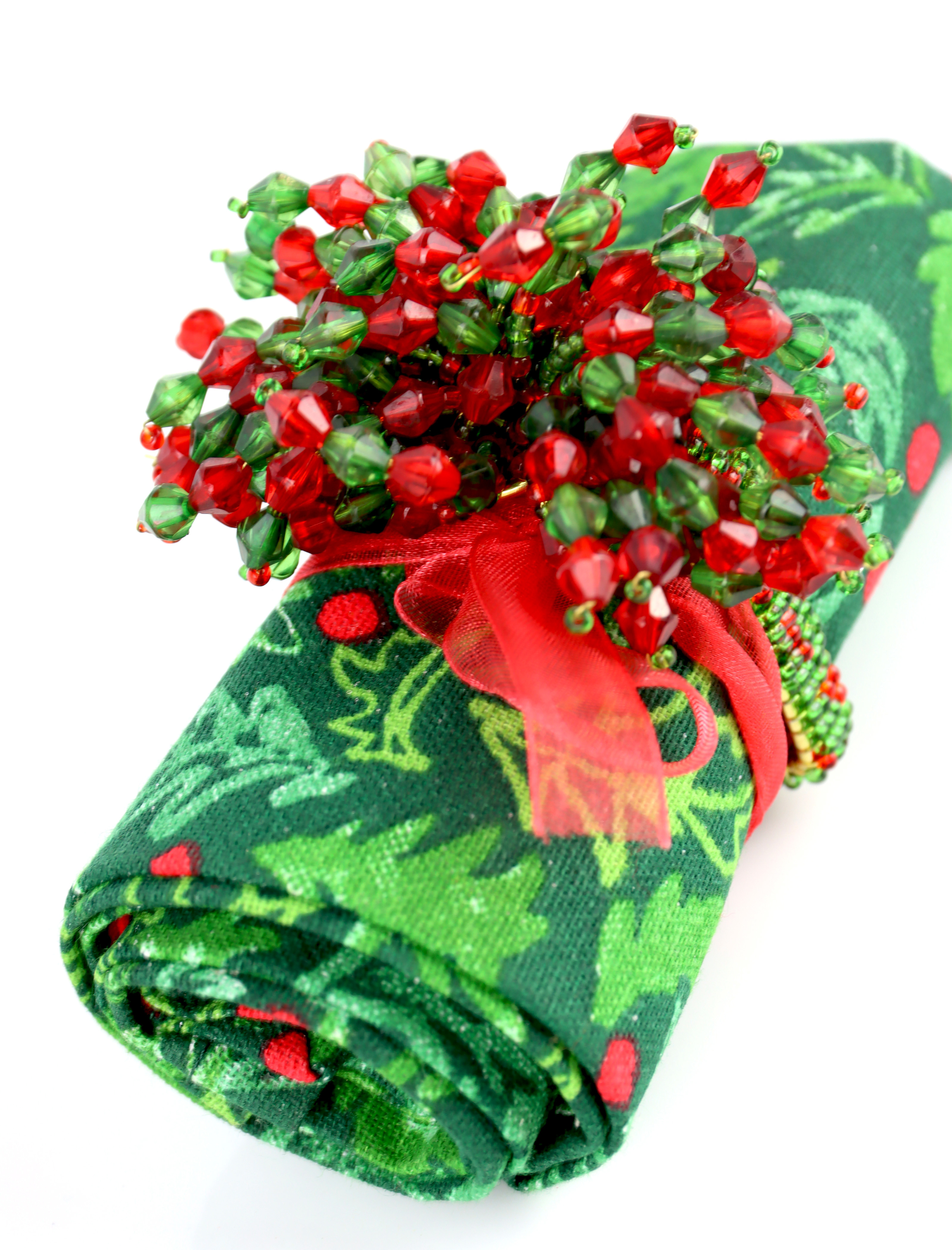 - Contains 8 products: 4 green napkins and 4 napkin rings in green and red.