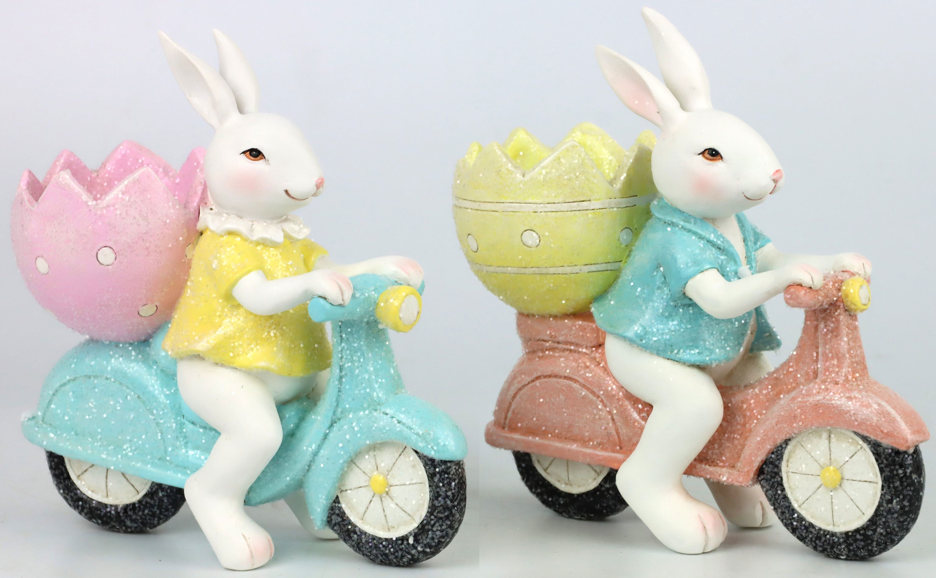 As the demand for individual and themed decorations is constantly growing, especially at Easter time, this set is a wonderful addition to your range. Your customers will appreciate the creative and charming attributes of these bunny figurines as they ride through the spring season on scooters. These vibrant and distinctive pieces are especially appealing to shoppers looking for unique decorative elements to enhance their homes.