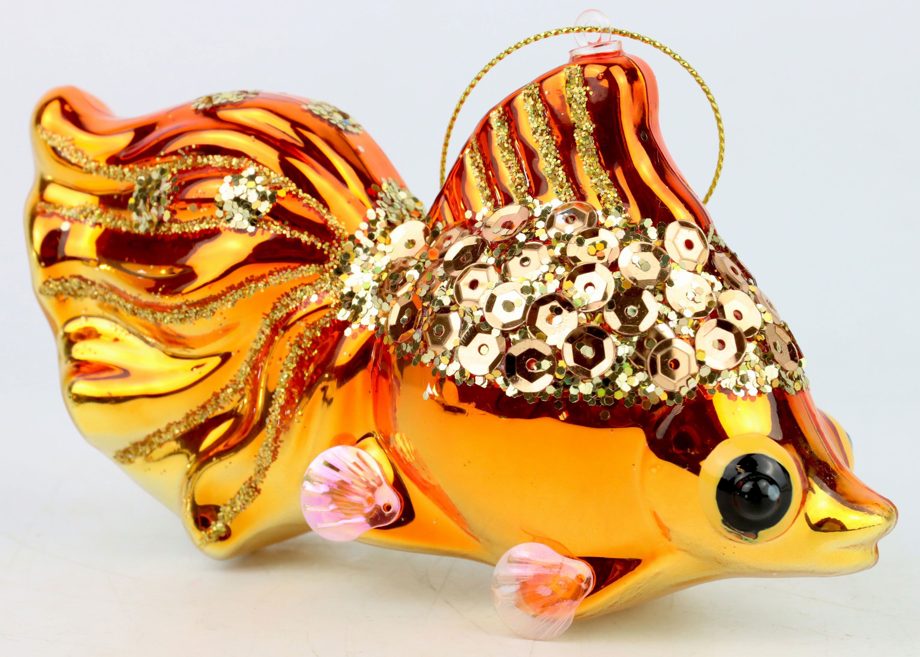 ENBring the magic of the underwater world to your Christmas tree with our popular "Goldfish" glass ornament. This pretty decorative item, item number 2208, is a specially crafted unique piece that will artfully add that little something extra to your Christmas decorations.