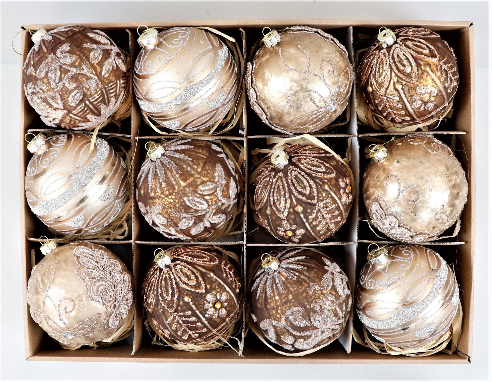 - 12-piece set of round glass baubles in bronze
