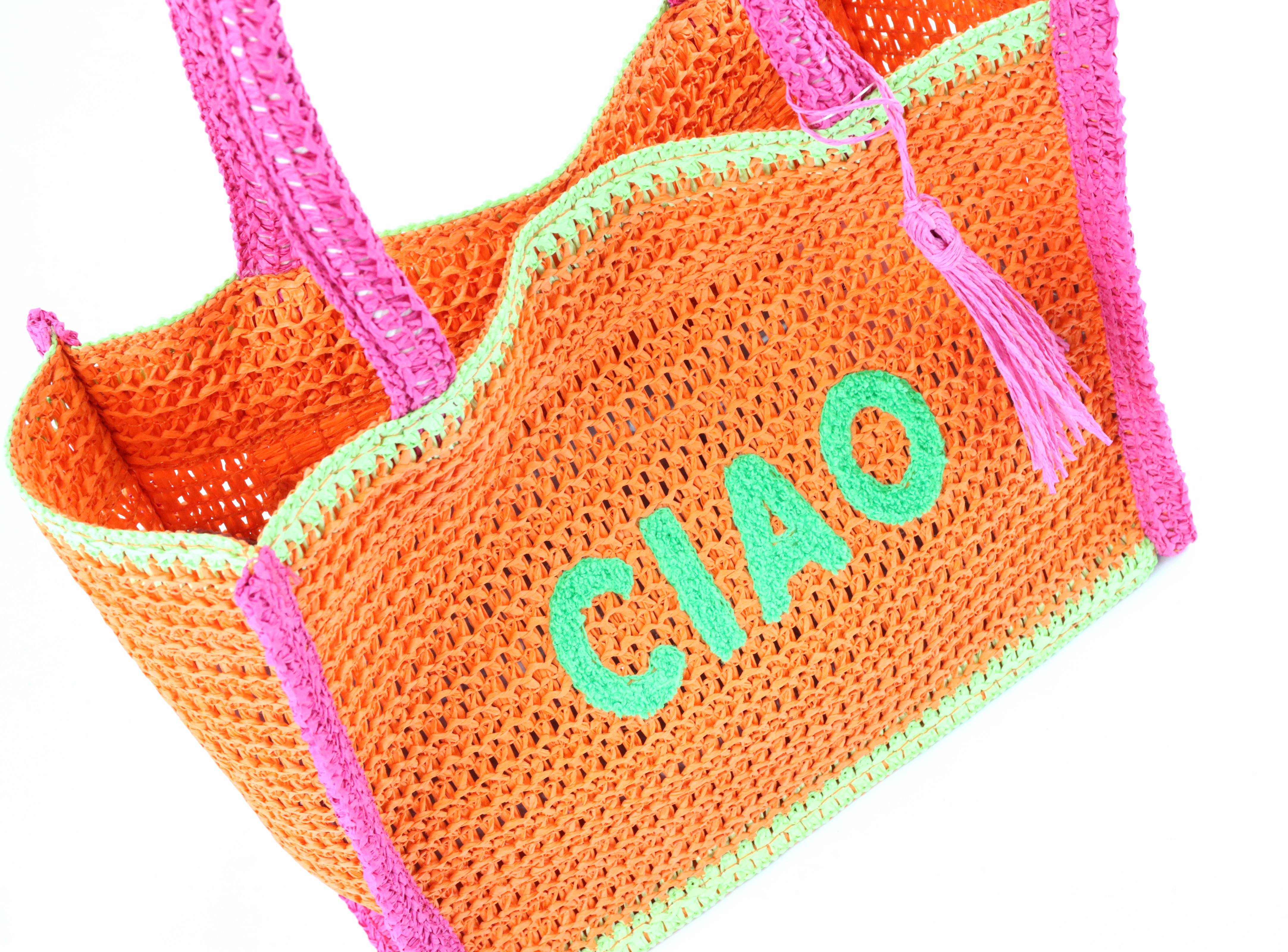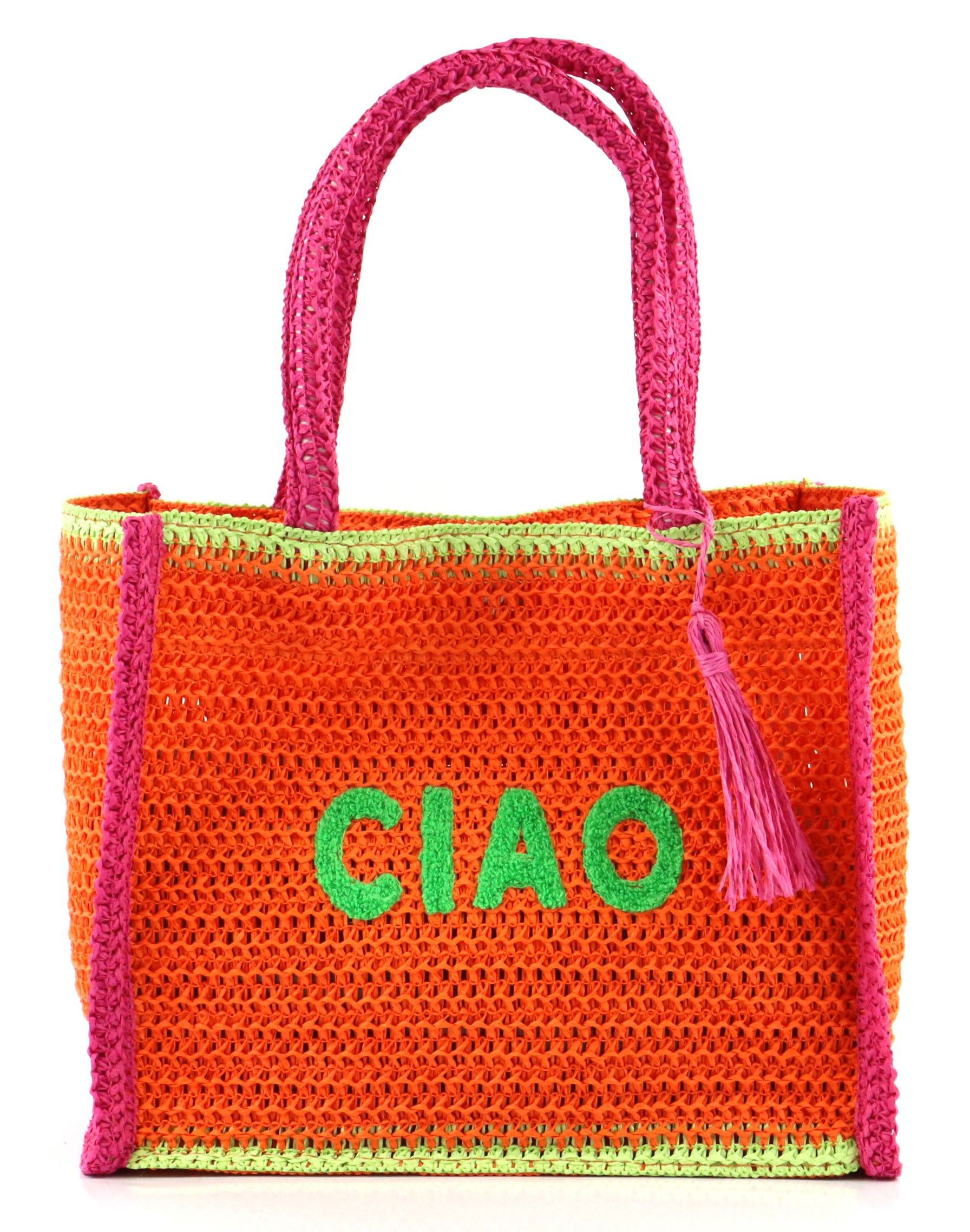 El minibolso "CIAO" destaca por sus llamativas letras en colores vivos: naranja y rosa. Este colorido diseño no sólo atrae las miradas, sino que también transmite una sensación de frescura y alegría de vivir que combina a la perfección con los armarios de primavera y verano. Con un tamaño compacto de aprox. 29 cm, este bolso shopper es la elección ideal para el uso diario o un accesorio encantador para un día relajado en la playa.