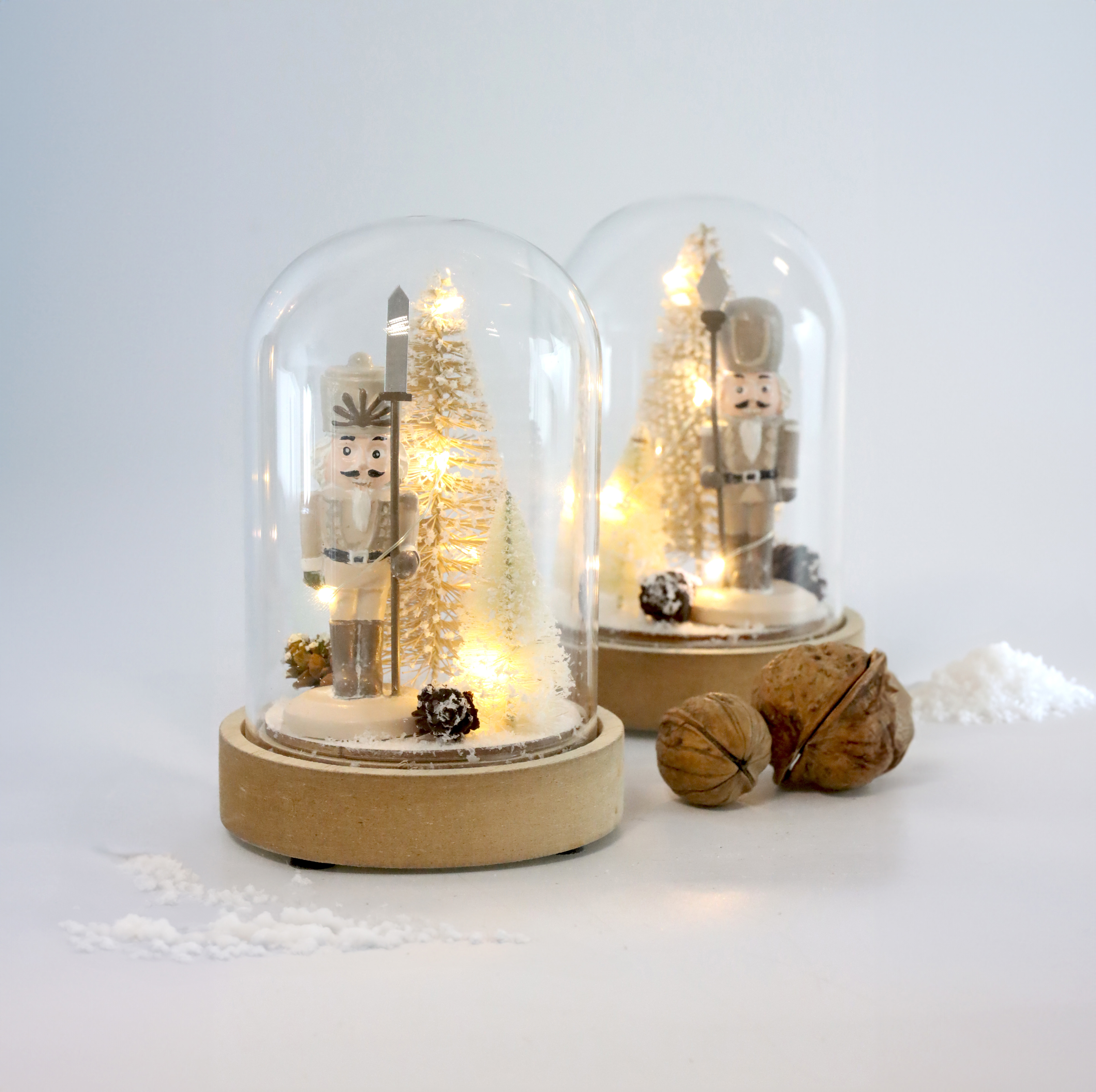 Las campanas emiten una luz cálida y acogedora gracias a la moderna tecnología LED. Funcionan con pilas, por lo que pueden utilizarse de forma flexible para decorar escaparates, estanterías y puntos de venta. Las brillantes luces LED iluminan el nostálgico cascanueces de madera y cristal, de unos 14 cm de altura.