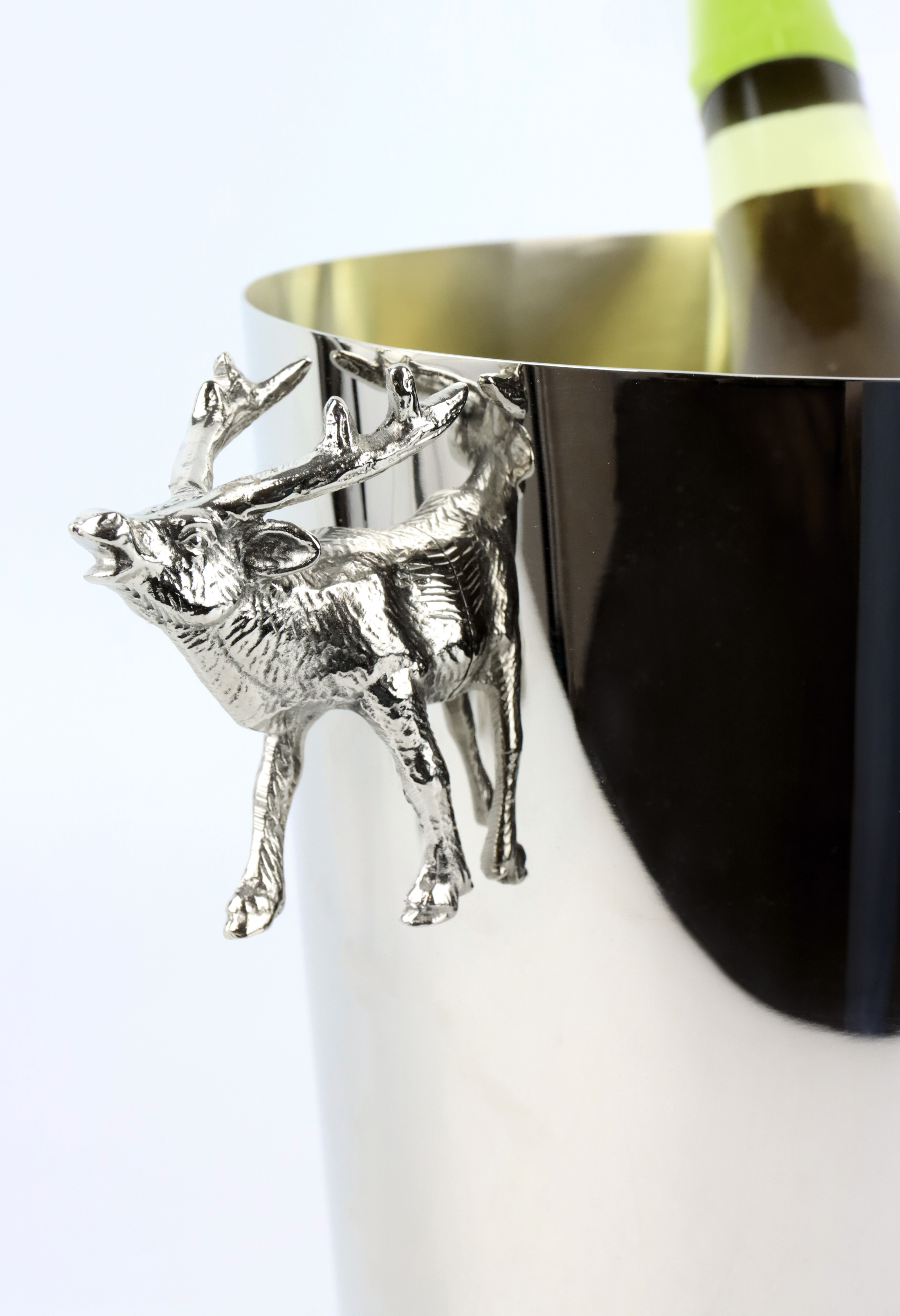 Mots-clés pertinents pour le SEO : refroidisseur de bouteille, cerf, aluminium nickelé, accessoires d'intérieur, produit lifestyle, saison automne-hiver, boutique en ligne B2B, commerce de détail, commerce stationnaire, décoration de table, présentation de boissons.