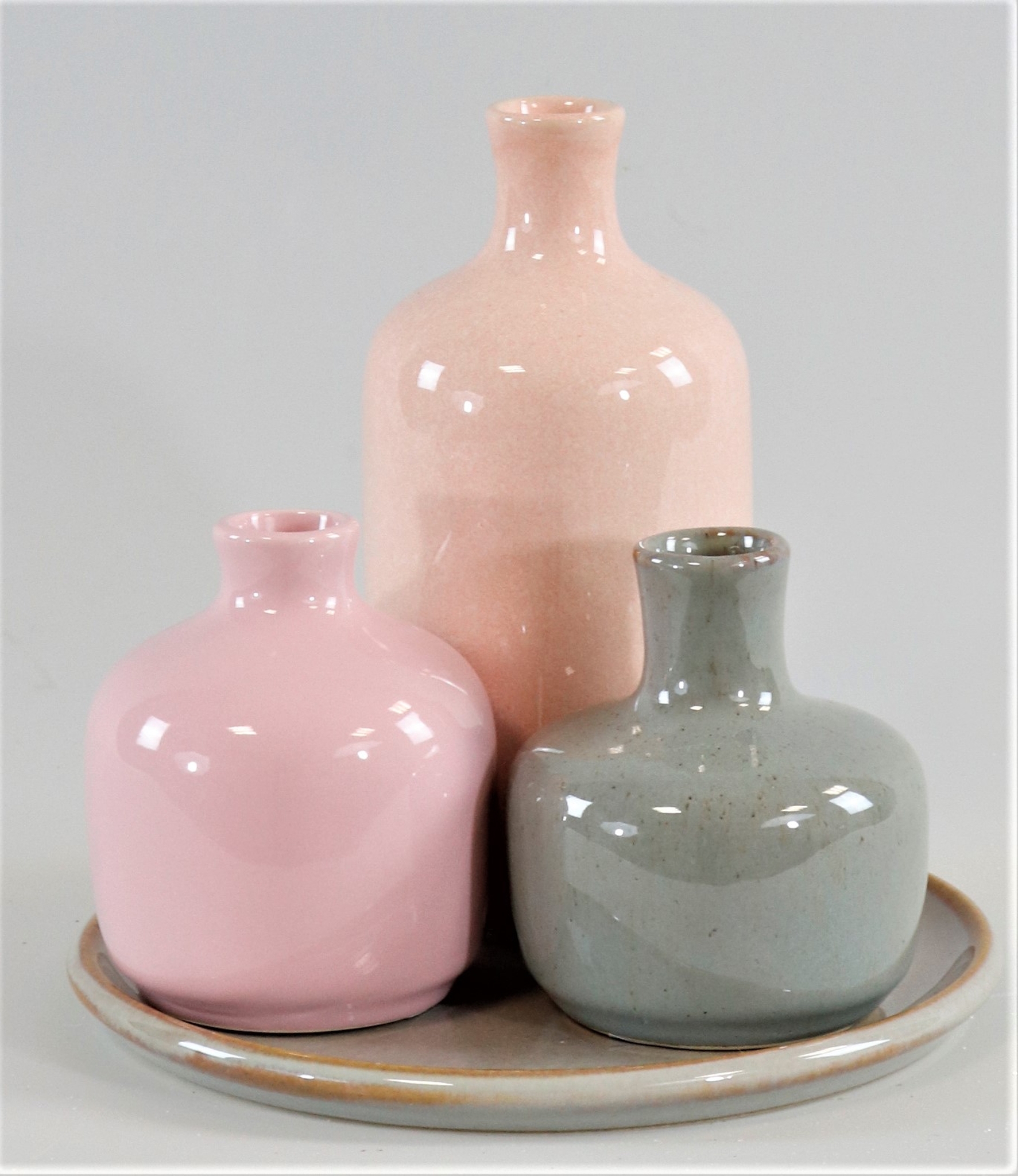 Cet ensemble n'est pas seulement une décoration, c'est une expression de style et de raffinement. Placez les vases sur l'assiette pour créer une composition globale harmonieuse ou répartissez les vases individuellement dans votre espace de vente pour valoriser visuellement différentes zones. Les clients apprécieront la polyvalence esthétique et l'élégance intemporelle de ces vases.