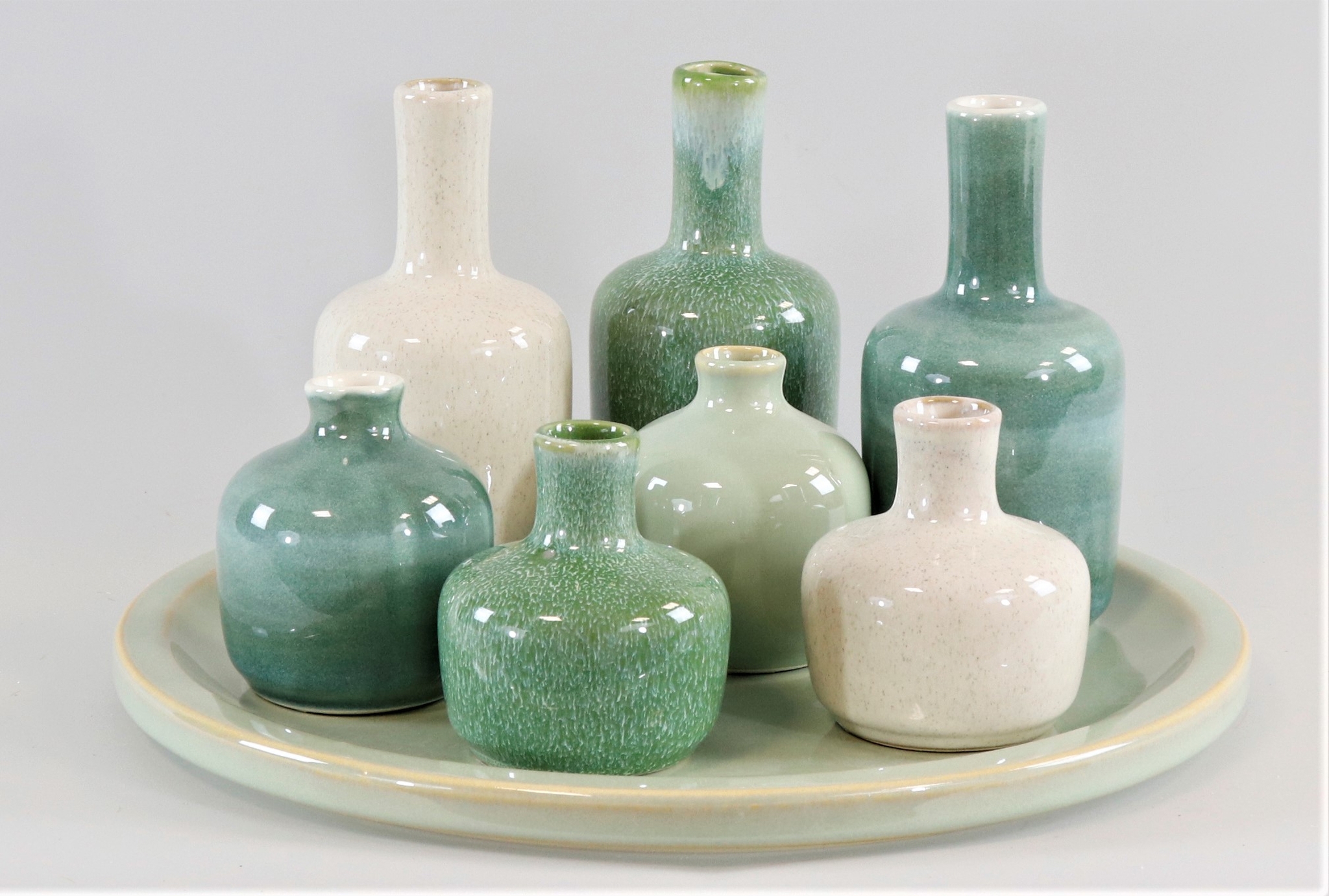 Découvrez dès maintenant l'ensemble de vases "Confetti", un véritable point fort pour le printemps et l'été dans vos magasins de décoration et d'art de vivre. Cet ensemble exclusif se compose de huit vases élégants, disposés sur une assiette en céramique d'un diamètre de 28 cm. L'ensemble réunit des éléments de différentes nuances de vert et apporte ainsi un vent de fraîcheur et de légèreté dans chaque intérieur. Avec un mélange élégant de petits vases d'environ 8 cm et de vases plus grands d'une hauteur d'environ 14 cm, le set offre de nombreuses possibilités pour des compositions florales créatives.