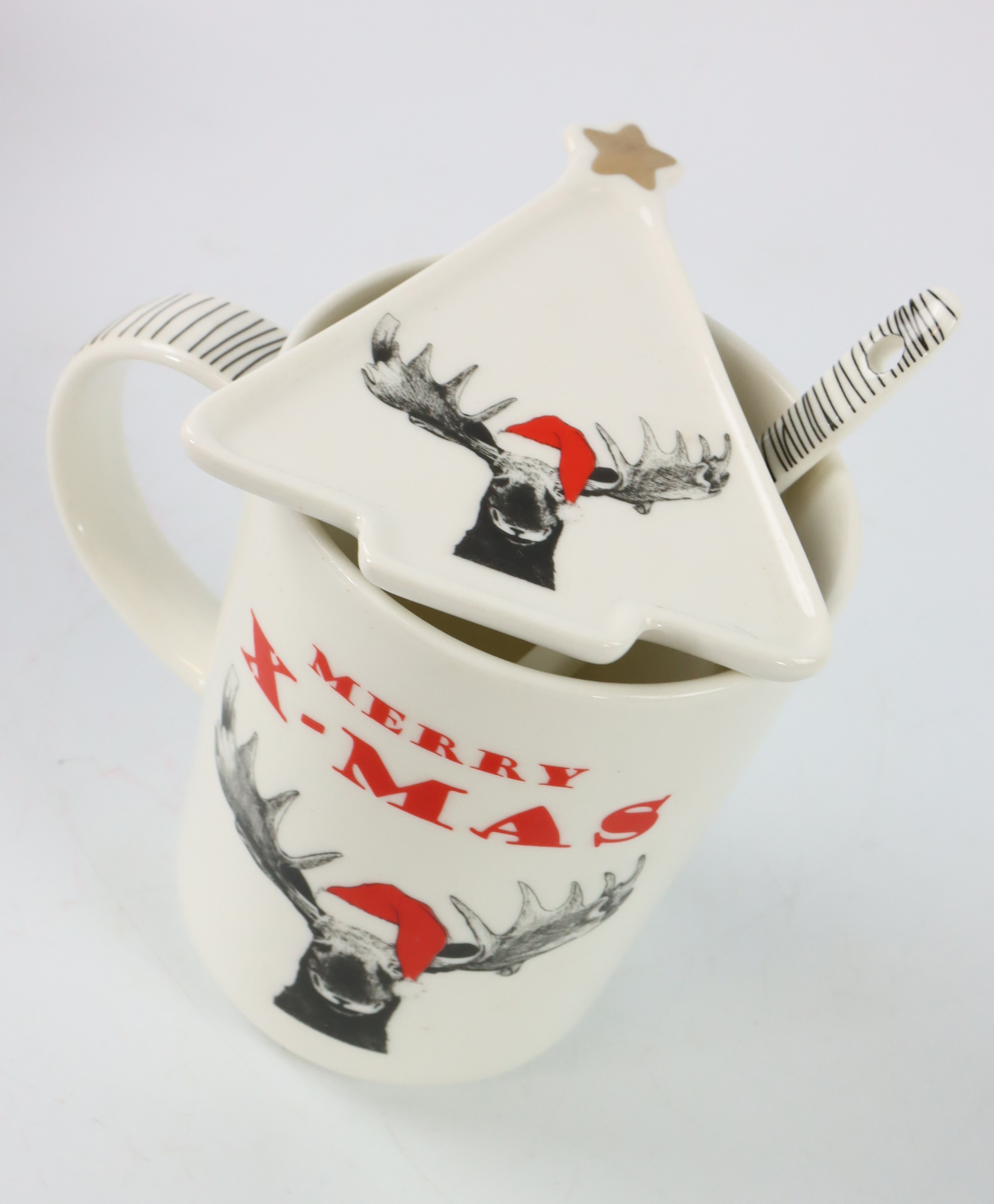Le set cadeau "Funny Moose" n'attire pas seulement le regard, c'est aussi un cadeau pratique qui est très demandé pendant la période de Noël. La tasse au joyeux motif d'élan peut accueillir des boissons chaudes et, avec ses 11,5 cm environ, assure une manipulation agréable. L'assiette en forme de sapin est parfaite pour présenter les friandises festives avec style, tandis que la cuillère en porcelaine assortie complète harmonieusement le set. Ce set est une idée de cadeau parfaite pour les clients qui cherchent quelque chose de spécial pour décorer leur table de fête ou pour faire plaisir à quelqu'un.