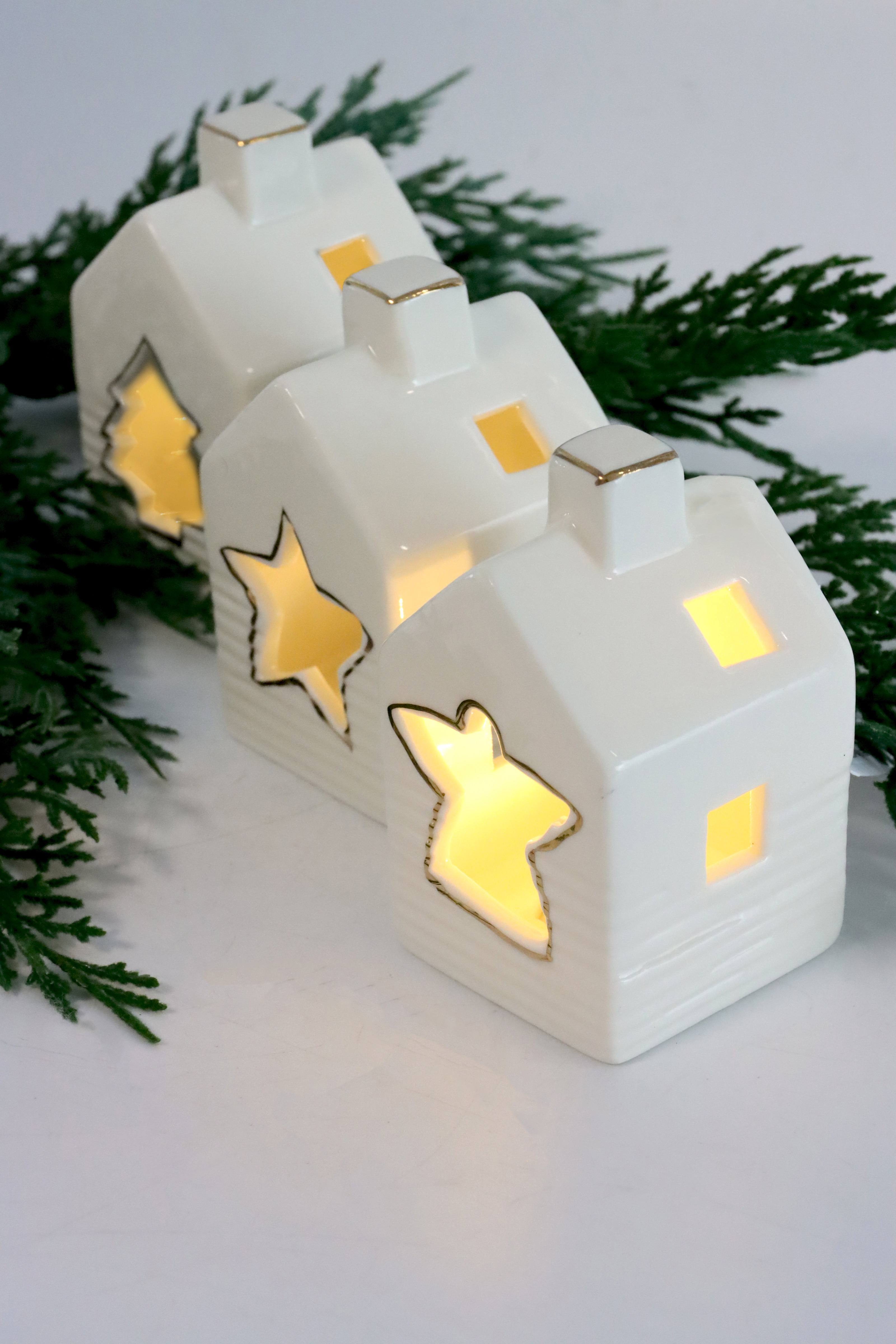 Faites briller votre site de vente au détail d'un nouvel éclat festif grâce à notre ensemble magique de maisons LED "Hus". Ce set de trois maisons illuminées par LED apporte le sapin de Noël enchanteur, l'ange céleste et les étoiles scintillantes directement dans vos rayons de vente. Chaque maison est fabriquée en céramique de haute qualité et mesure environ 11,5 cm de haut - parfait pour être positionnée à différents endroits dans votre magasin et attirer l'attention de vos clients.