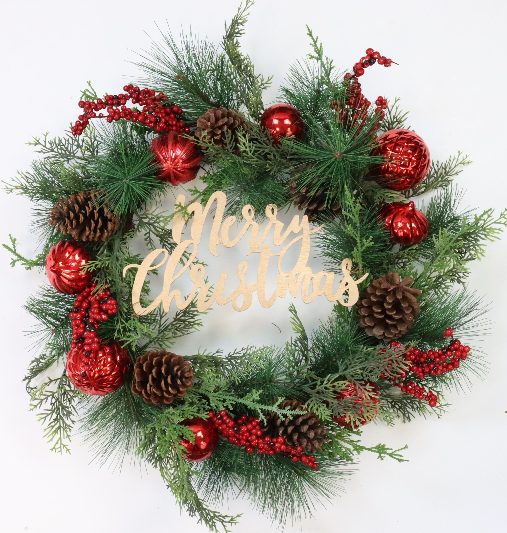 L'inscription "Merry Christmas", intégrée à la couronne et réalisée dans une écriture élégante, apporte un charme supplémentaire et donne à chaque client un sentiment d'accueil chaleureux lorsqu'il entre dans votre magasin. Les couleurs vives et le design attrayant font que cette couronne décorative attire tous les regards et deviendra à coup sûr le point fort de votre décoration de Noël.