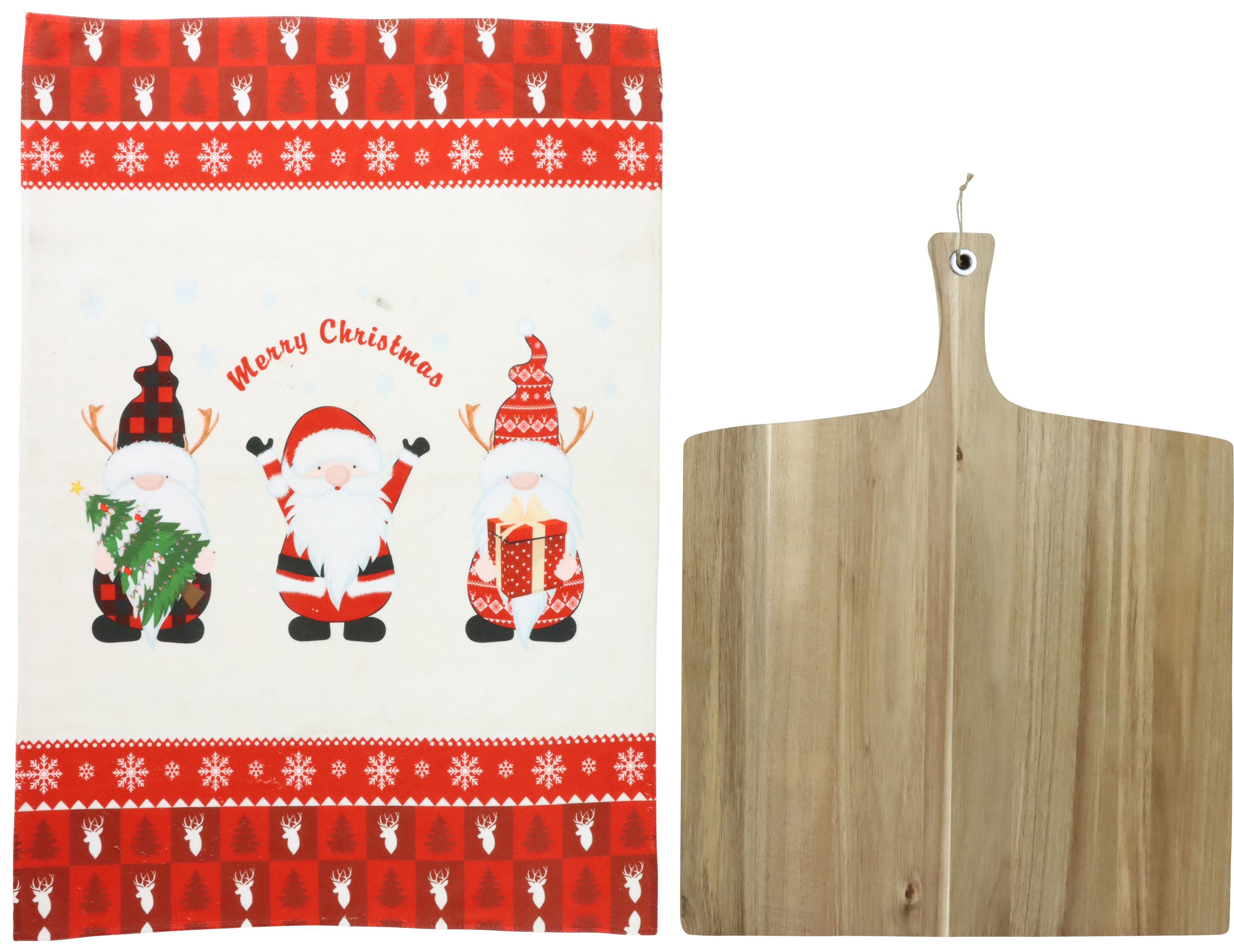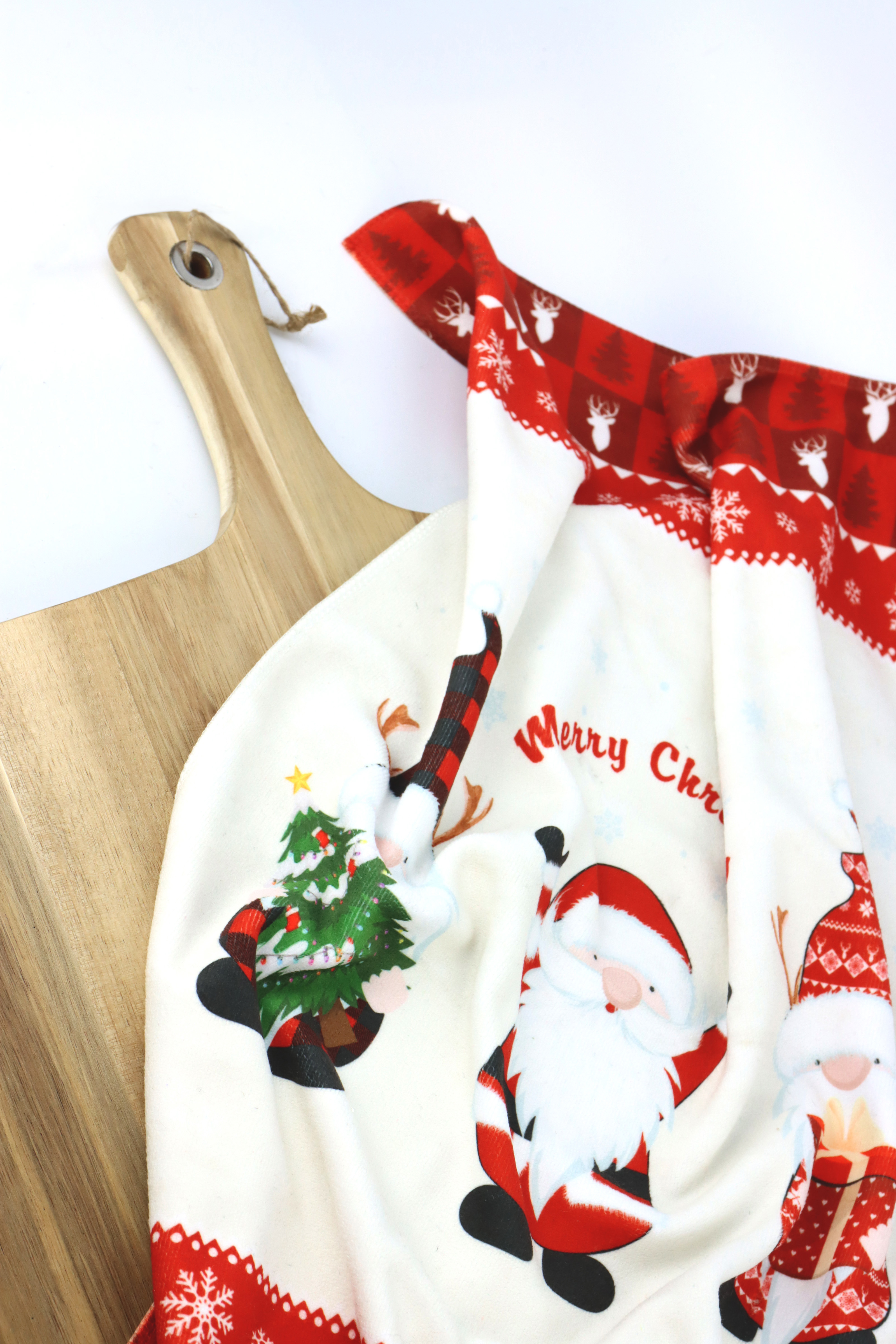 La planche en bois est accompagnée d'un torchon de cuisine festif qui, avec son design de Noël et ses dimensions de 40x60 cm, n'est pas seulement pratique, mais aussi un point fort visuel. Fabriqué en coton de qualité supérieure, il promet longévité et confort pour sécher la vaisselle ou essuyer les petits accidents qui peuvent vite arriver en cuisinant. Le design du torchon de cuisine convient parfaitement à la période de Noël et s'intègre harmonieusement dans les décorations saisonnières.