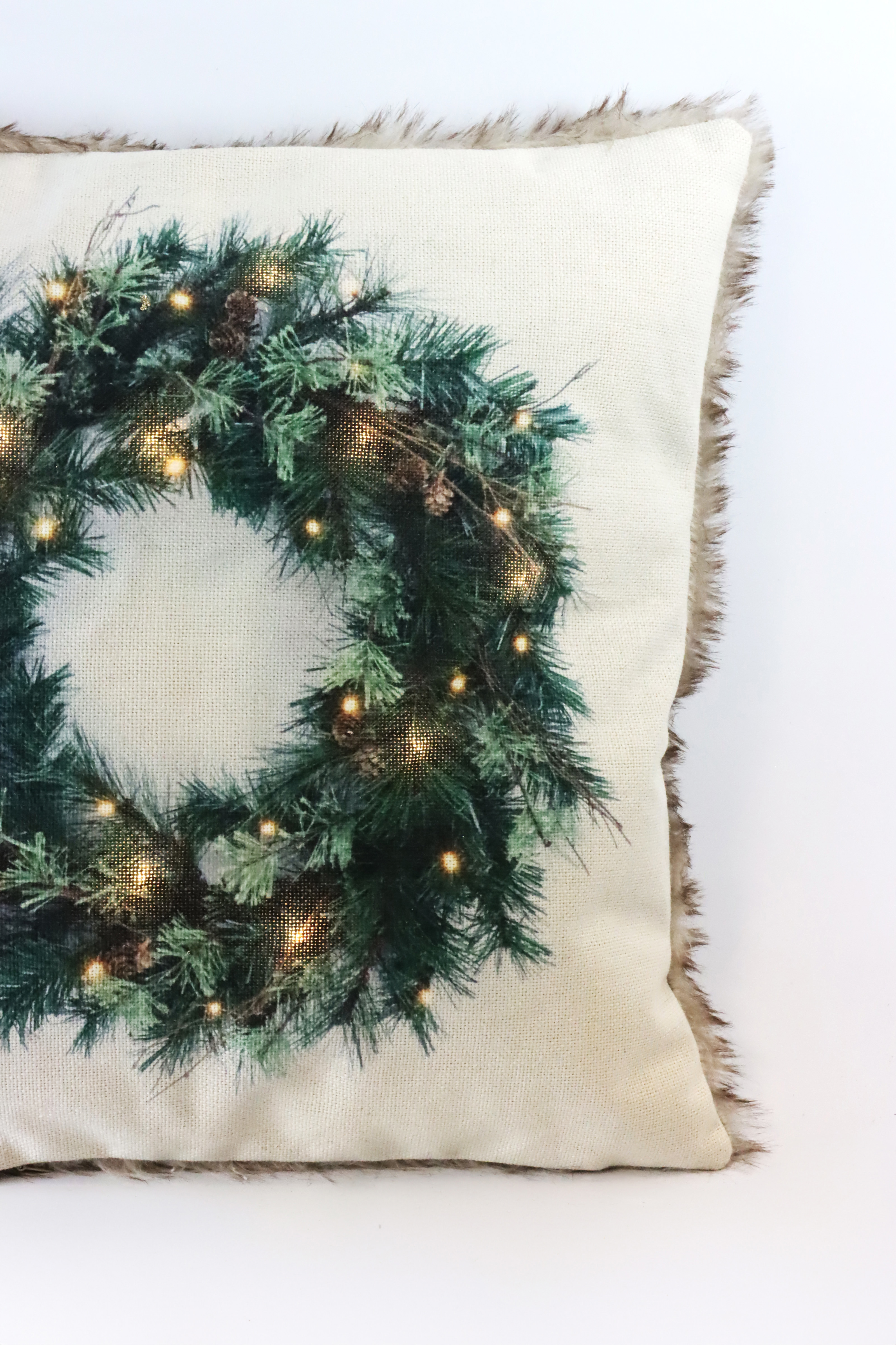 Mots-clés : couronne LED, housse de coussin, décoration de Noël, accessoires d'intérieur festifs, idées de cadeaux, habitat et style de vie, housse de coussin en polyester, fausse fourrure, éclairage à piles, style de vie de Noël.