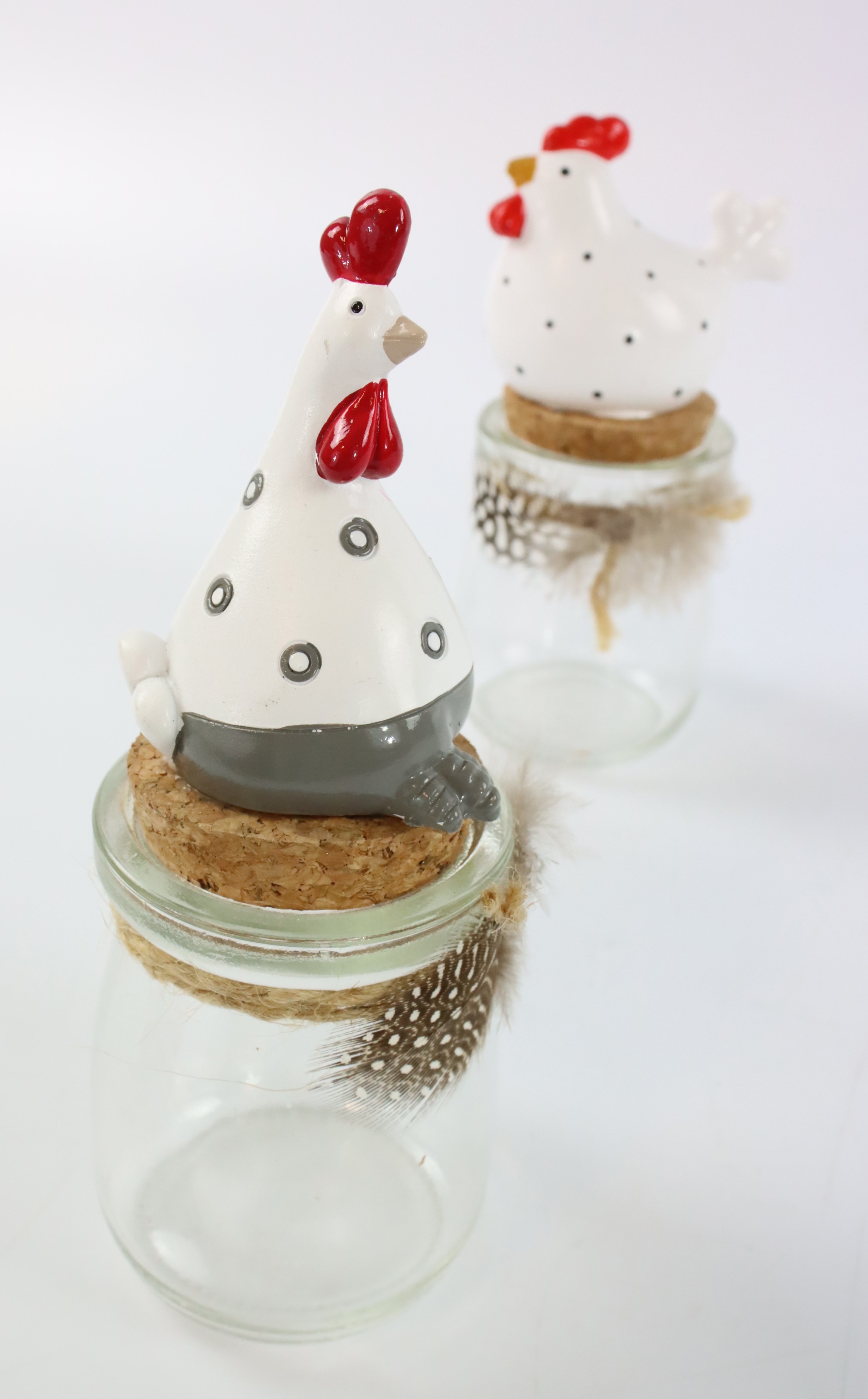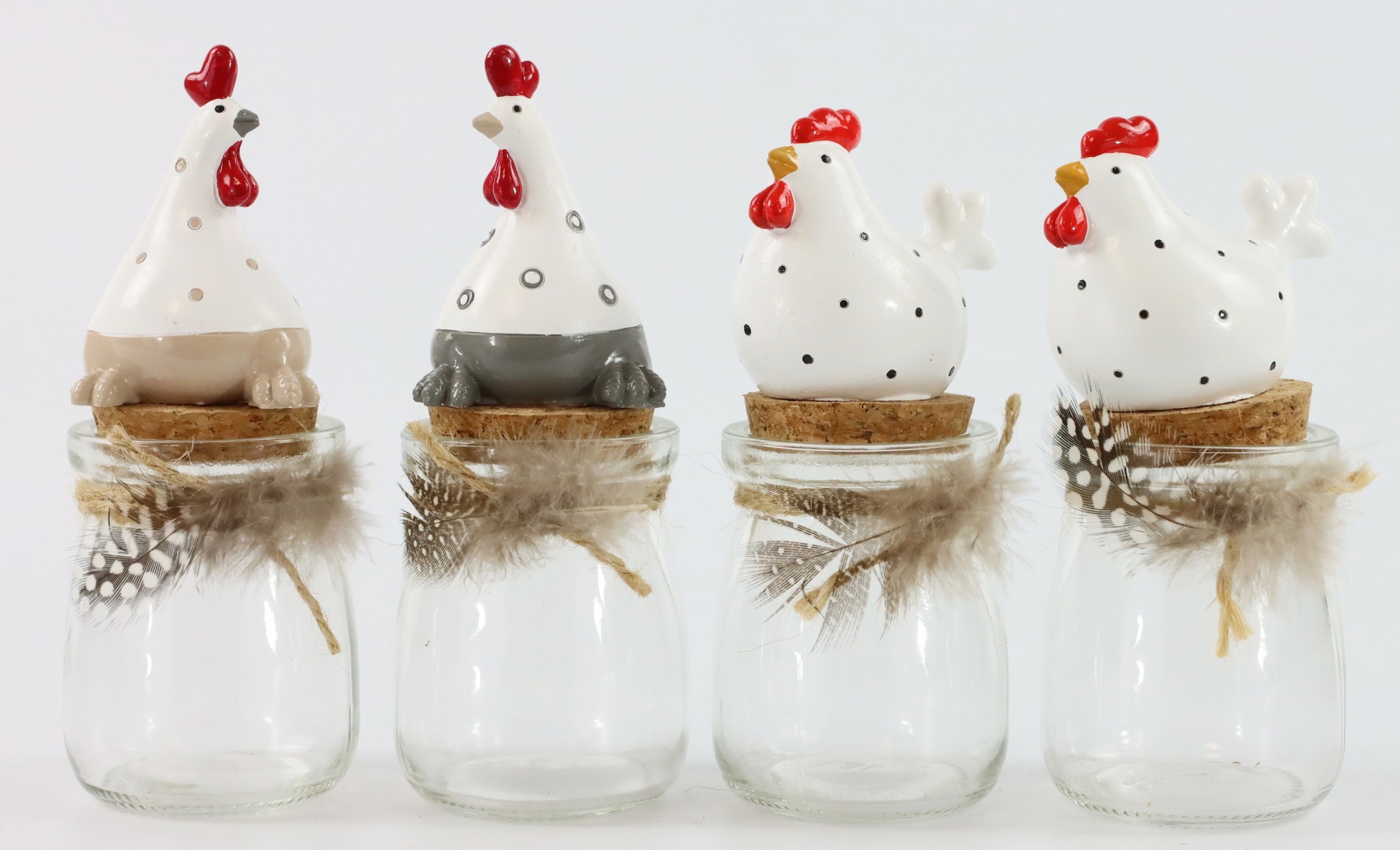 - Le set se compose de quatre boîtes en verre avec une poule blanche décorative.