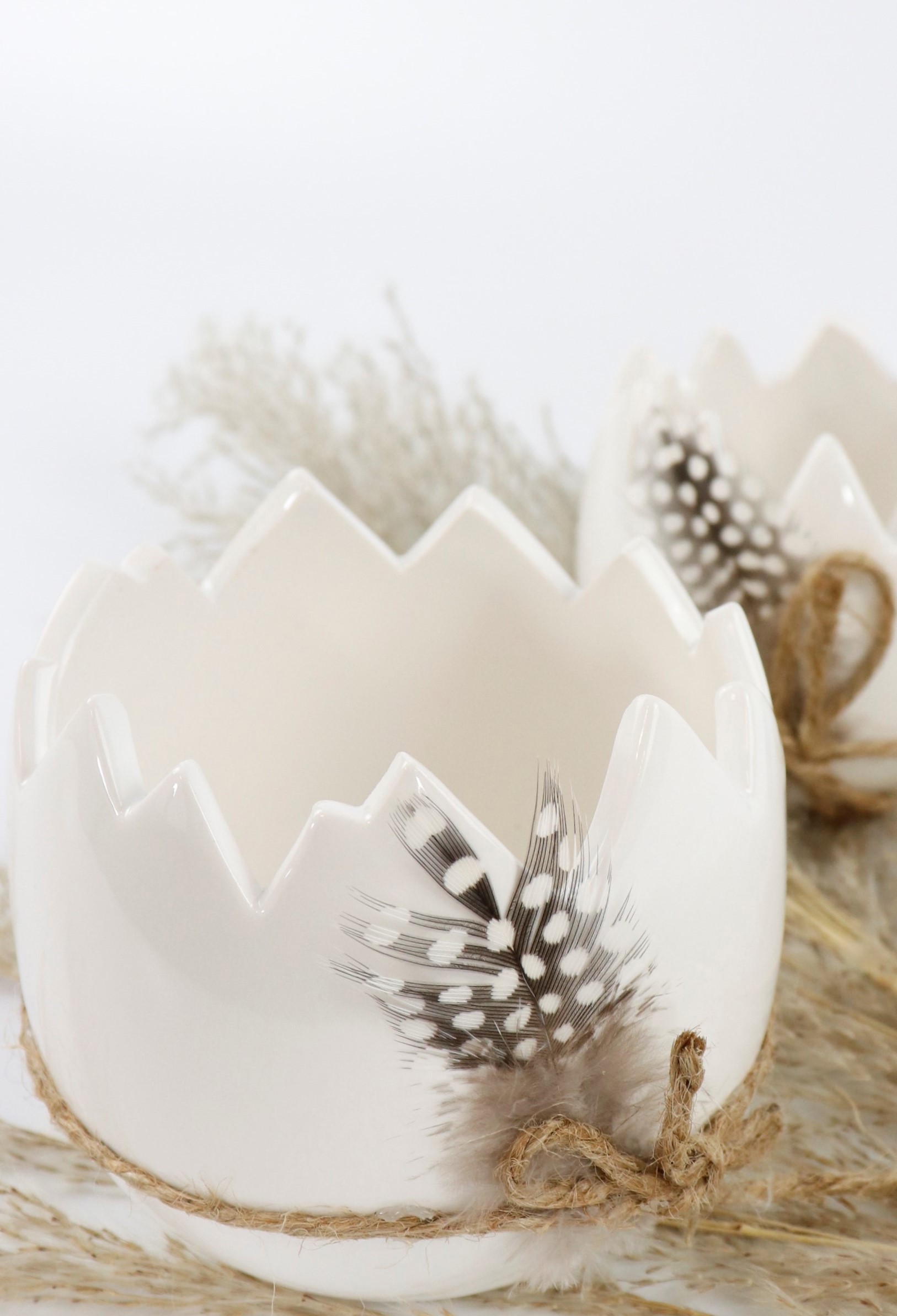 Fabriquées en porcelaine de qualité supérieure, les coupes à œufs se distinguent par leur finition particulière et leur motif de plumes unique. Le design léger comme une plume symbolise à la fois le printemps et l'ambiance festive de Pâques, ce qui les rend idéales pour compléter une présentation de produits saisonniers. La surface brillante des coupes reflète merveilleusement la lumière et met en valeur les détails délicats du motif de plumes. Cette finition spéciale garantit une grande longévité et fait de ces coupes un objet de décoration durable pour des années.
