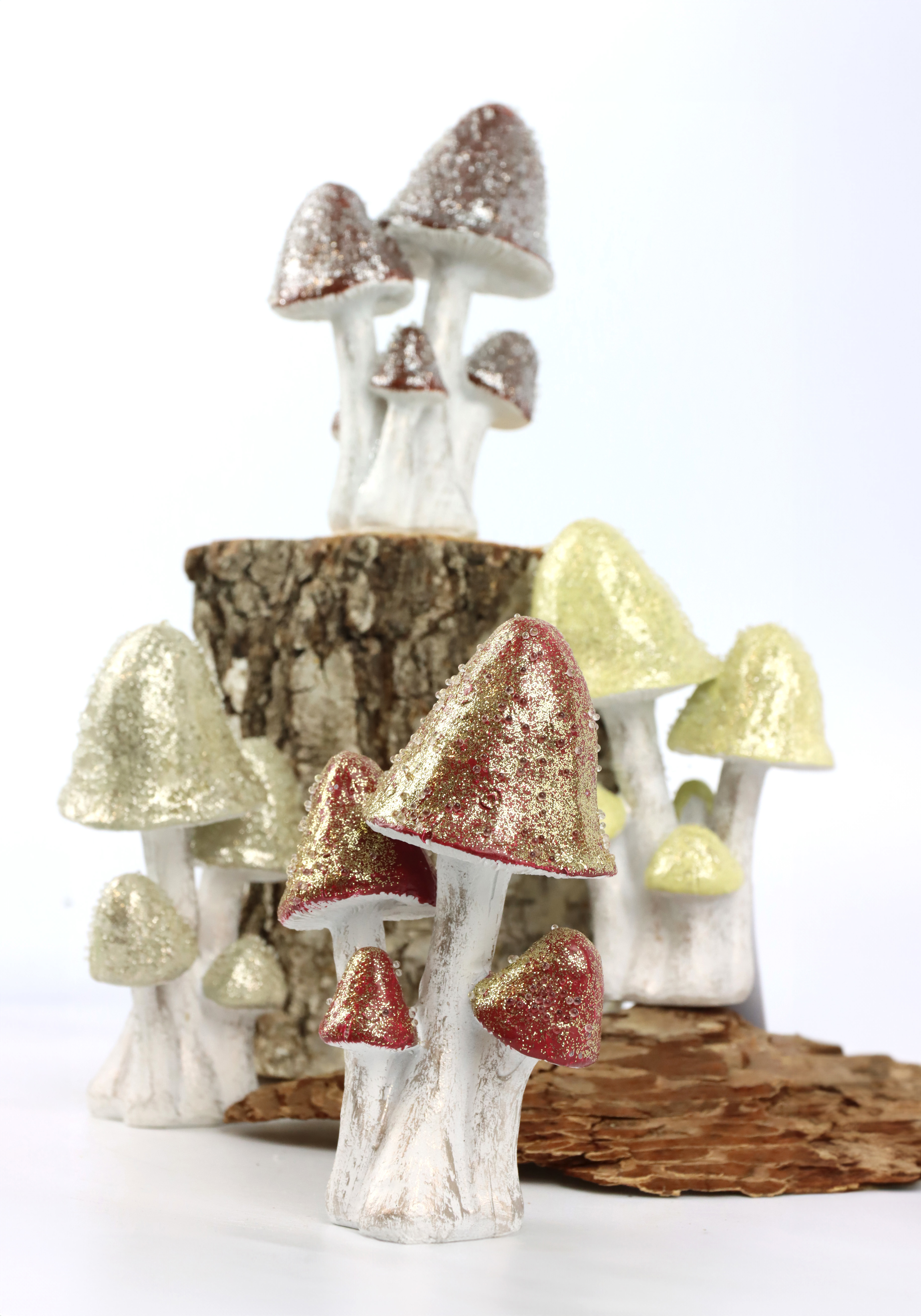 Bien que ces champignons soient parfaits pour la période de Noël, ils peuvent également être utilisés bien au-delà des fêtes. Ils attirent extraordinairement l'attention comme décoration de table, dans une fenêtre ou comme étalage de vitrine. C'est pourquoi notre set de 4 pièces "CHAMPIGNONS GLAMOUR" est synonyme de polyvalence et de longévité.