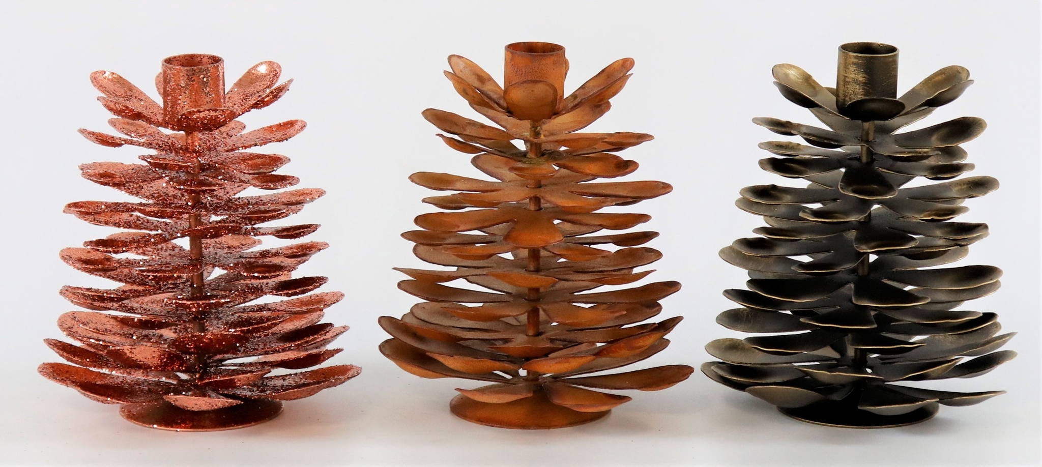 Le set comprend trois chandeliers au design individuel, qui ont la forme de pommes de pin. Chaque exemplaire est fabriqué en métal de haute qualité et mesure environ 15 cm, ce qui les rend pratiques et polyvalents en termes de placement. Vous pouvez placer ces chandeliers sur une table d'appoint, sur le rebord d'une fenêtre, sur le manteau d'une cheminée ou dans une bibliothèque et vous verrez comment ils apportent immédiatement une touche de charme.