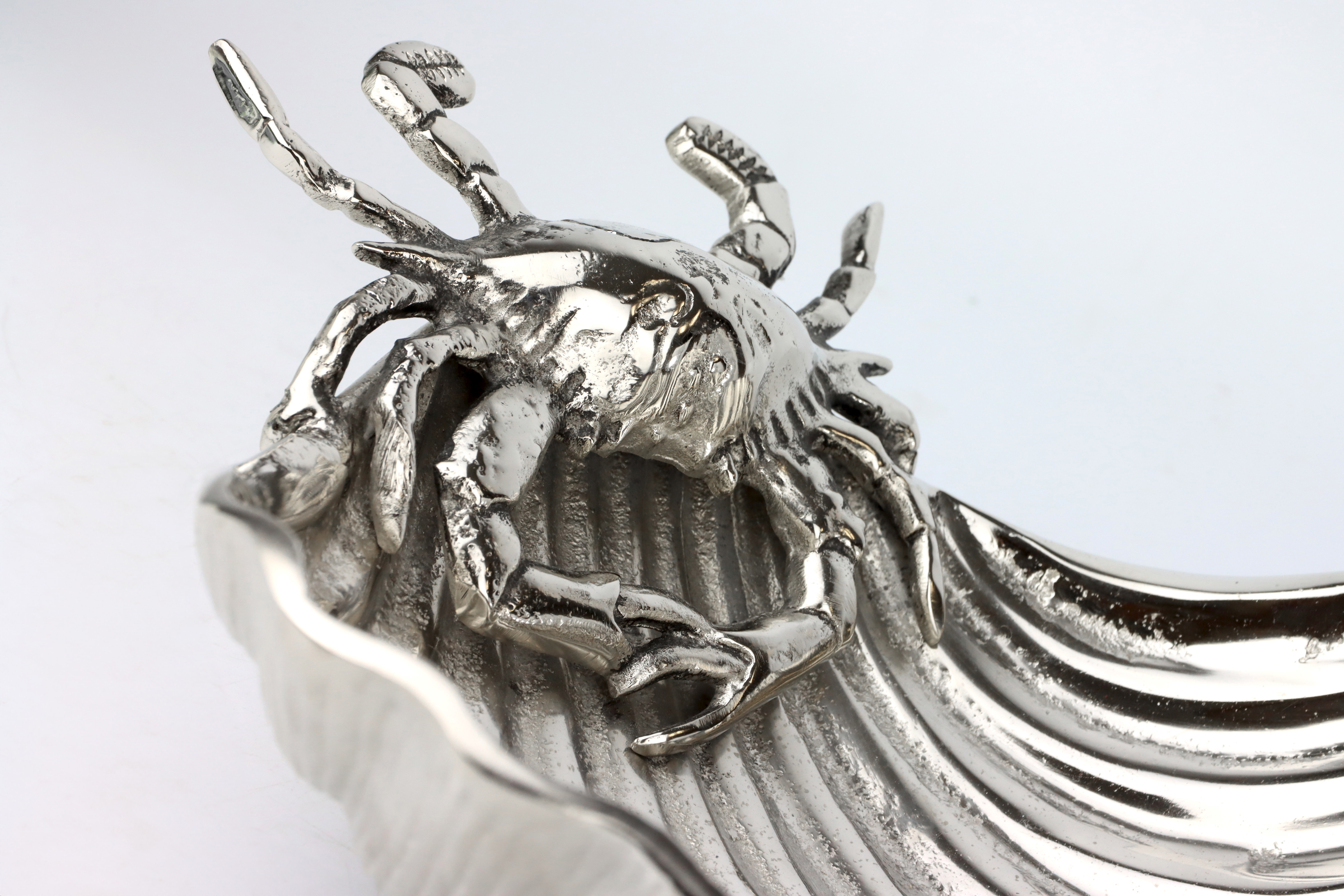 Scoprite l'esclusiva ciotola a conchiglia "Ocean", un'opera d'arte che unisce eleganza e naturalezza in qualsiasi ambiente. Questa conchiglia decorativa di alta qualità, realizzata in pregiato materiale argentato, non è solo un richiamo visivo, ma anche l'accessorio perfetto per i rivenditori più esigenti del settore casa e lifestyle. Con la sua finitura in filigrana e il granchio dettagliato, accuratamente posizionato sul bordo della ciotola, la conchiglia "Ocean" attira l'attenzione di tutti e trasforma qualsiasi ambiente in un'elegante oasi di benessere.