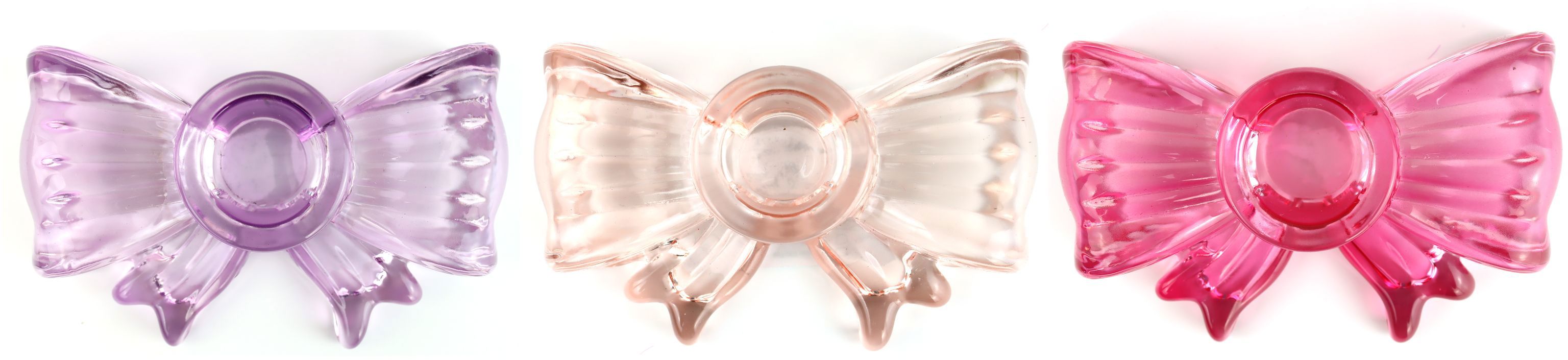 Il set di candelieri "Glow Bow" si distingue per l'esclusiva forma a fiocco, che aggiunge una sottile raffinatezza a qualsiasi ambiente. L'elegante finitura rosata, realizzata in vetro di alta qualità, dona un morbido e romantico luccichio che riflette magnificamente la luce delle candele. Con un'altezza di circa 10 cm, i candelieri sono ideali per tavoli, mensole o davanzali e si adattano perfettamente a qualsiasi concetto decorativo, moderno, classico o romantico.