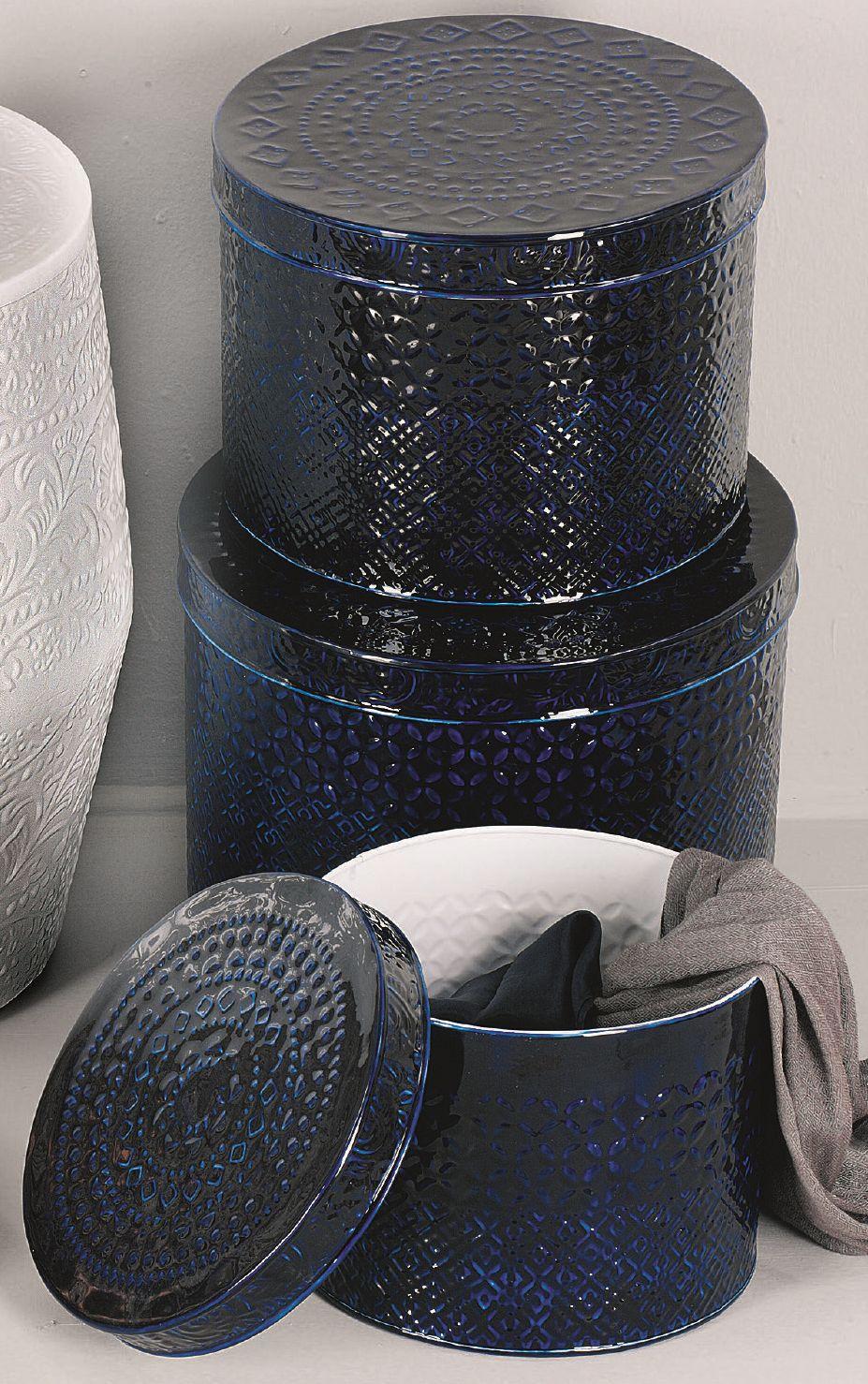 Provate la perfetta combinazione di funzionalità e stile con il nostro set di scatole di latta "Fès". Questo set di tre pezzi non solo offre soluzioni pratiche per riporre gli oggetti, ma è anche un'attrazione estetica che darà il tono giusto alle stanze dei vostri clienti. I barattoli di latta sono disegnati in un sofisticato colore blu e si adattano perfettamente ai moderni concetti di vita, rendendoli un assortimento ideale per i rivenditori del settore casa e lifestyle.