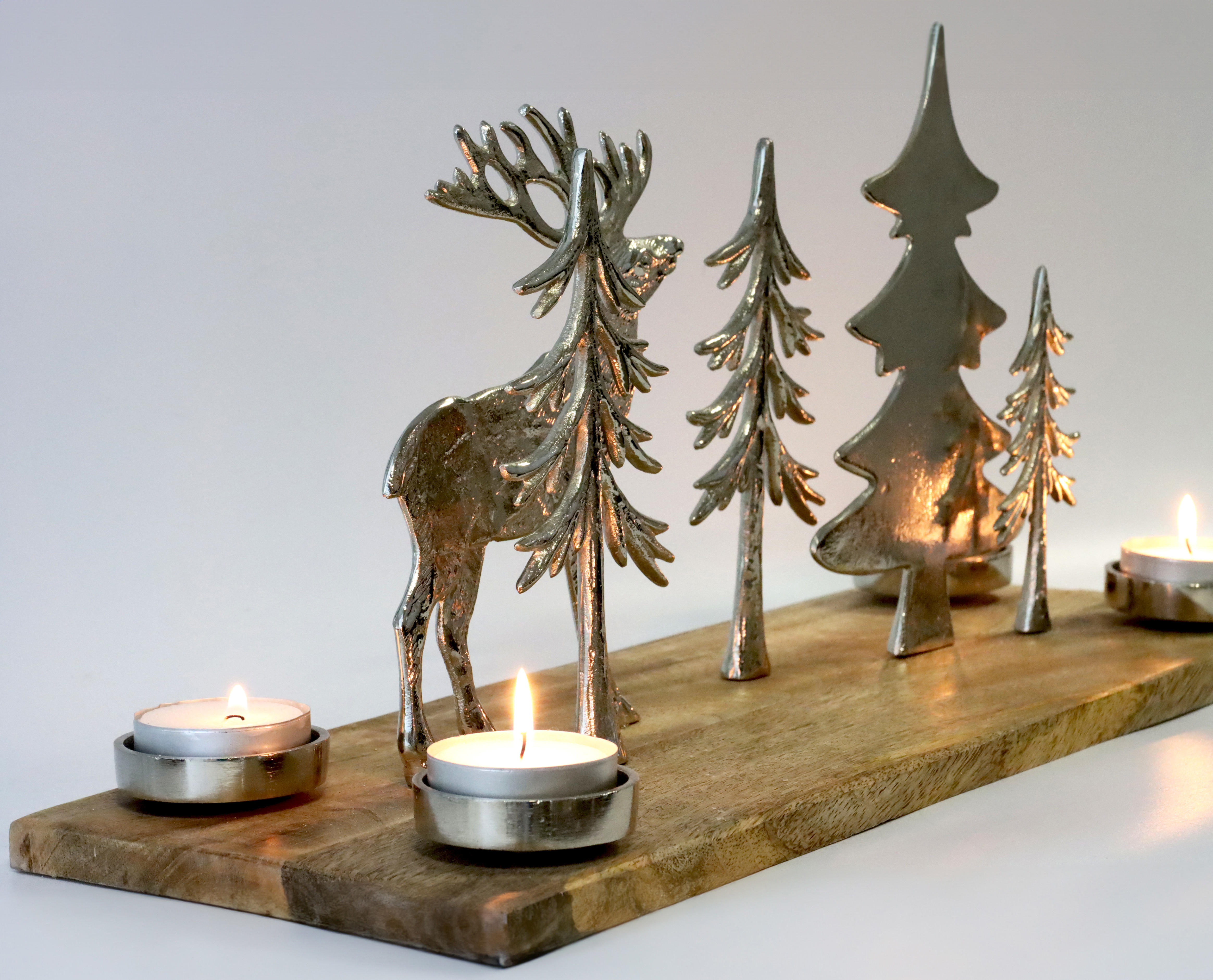 Parole chiave: portacandele, decorazione natalizia, decorazione festiva, prodotti lifestyle, accessorio per la casa, decorazione al dettaglio, foresta invernale, oggetto luminoso, decorazione in alluminio.