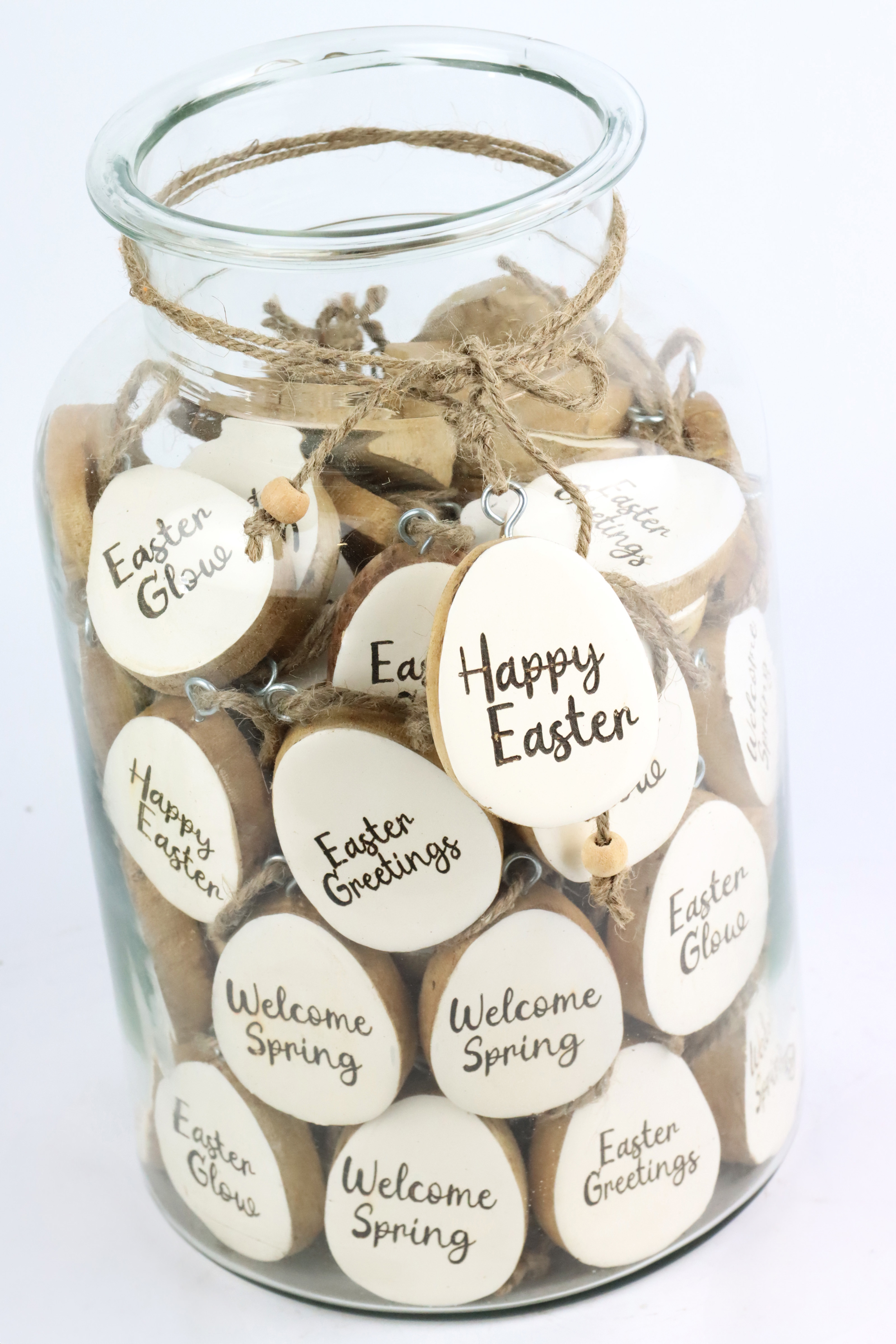 - **Presentazione**: L'espositore decorativo in vetro mette in risalto con stile gli appendini per le uova e ne facilita la presentazione.