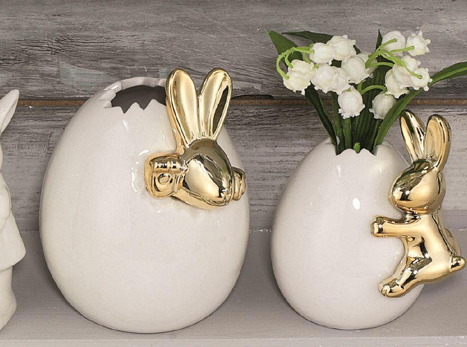 Il set è composto da due vasi per uova di dimensioni diverse: Il vaso più piccolo misura 9,2 cm e il vaso più grande 11 cm, entrambi idealmente proporzionati per essere collocati su tavoli, mensole o credenze. L'elegante finitura dorata di questi vasi in porcellana conferisce loro un aspetto sofisticato che può essere interpretato sia in modo tradizionale che moderno.