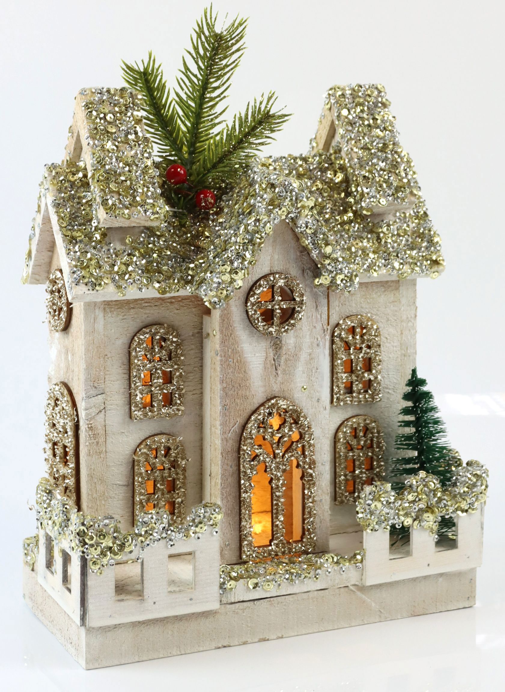 Mit einer Höhe von etwa 26 cm und einer charmanten Farbgebung in edlem Gold ist das LED-Haus ein echter Hingucker in jedem Wohnambiente. Seine hochwertige Verarbeitung aus Holz und Kunststoff sorgt nicht nur für eine ansprechende Optik, sondern garantiert auch eine langlebige Qualität, die Ihre Kunden Jahr für Jahr aufs Neue begeistern wird.