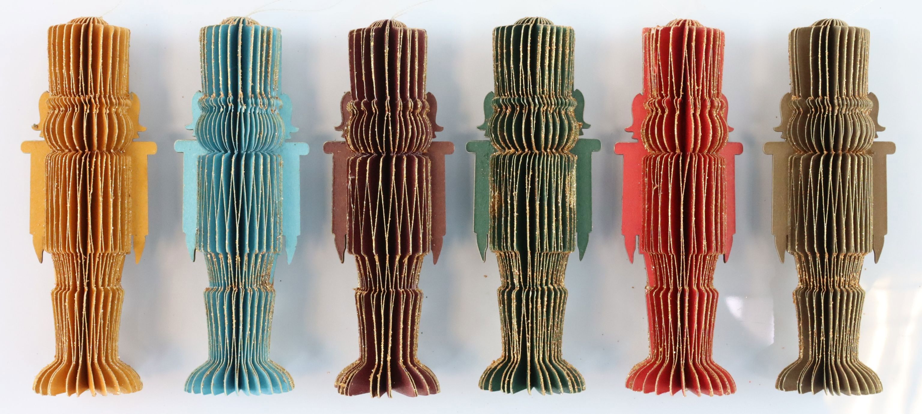 DEEntdecken Sie das zauberhafte NUSSKNACKER-Set "HONEYCOMB" S/6, das Ihrem Geschäft während der Weihnachtszeit eine festliche und elegante Atmosphäre verleiht. Dieses stilvolle Set besteht aus sechs kunstvoll gefertigten Nusknackern, die in den lebendigen Farben Orange, Braun, Grün, Blau und Rot gehalten sind und durch einen edlen Goldrand akzentuiert werden. Jeder der farbenfrohen Nusknacker ist etwa 10 cm groß und aus hochwertigem Papier im Wabenmuster (oft als "honeycomb" bekannt) gefertigt, was ihnen eine einzigartige 3D-Struktur und damit eine besondere optische Tiefe verleiht.