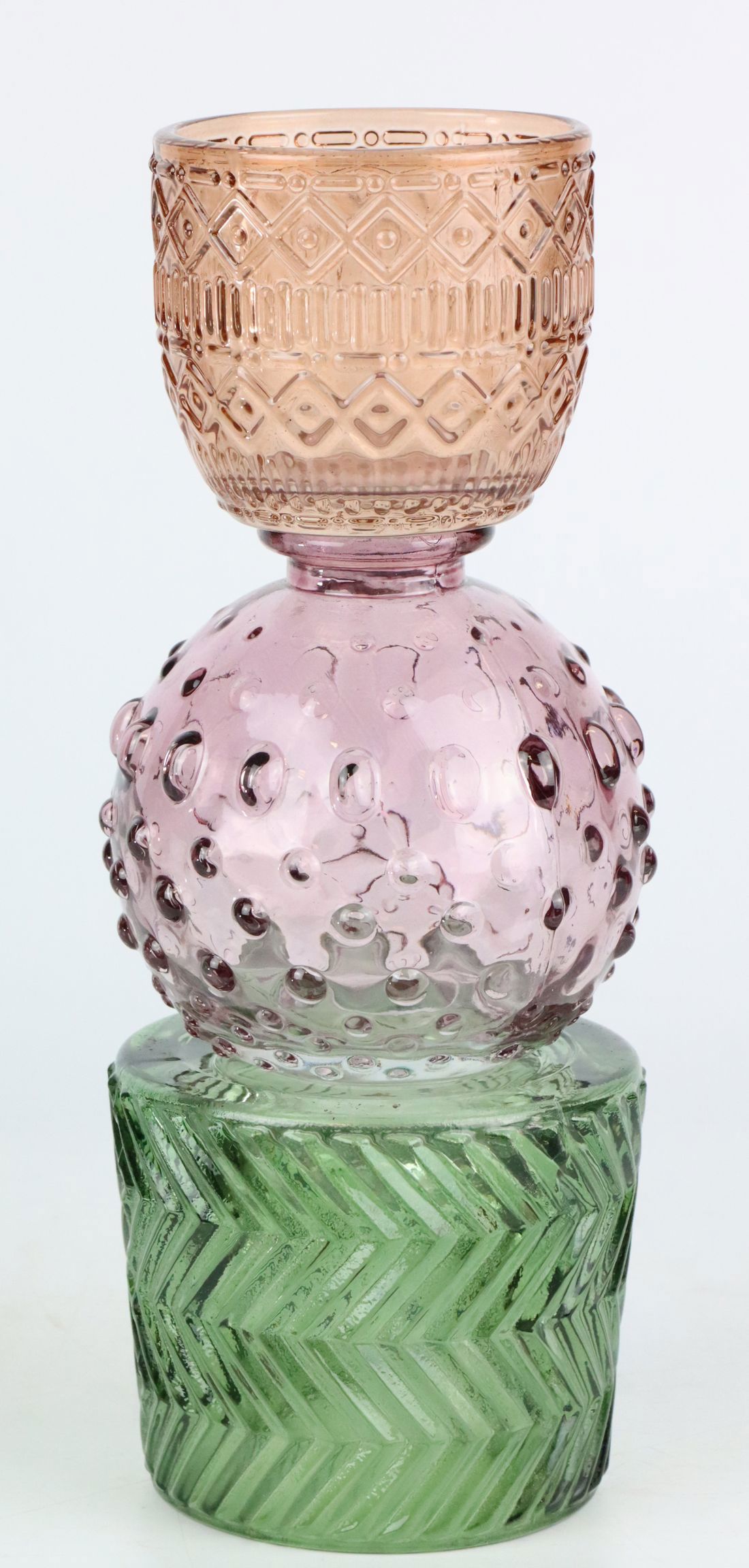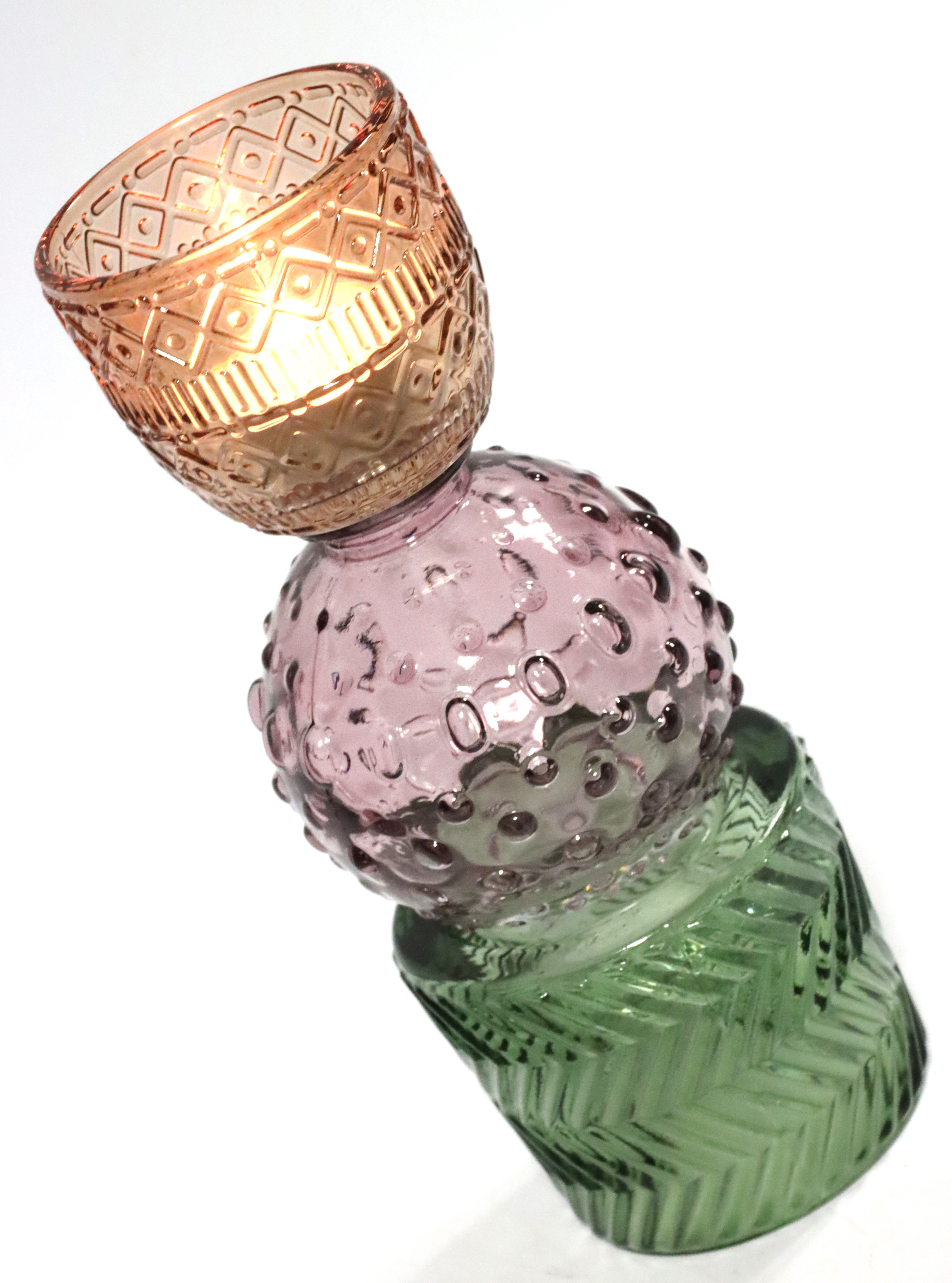 Der sanfte Farbverlauf von Grün über Lila zu Orange harmoniert gut mit natürlichen und warmen Herbst-Winter-Farben wie Braun, Beigetönen und dunklen Holztexturen. Nutzen Sie diesen Leuchter, um Ihren Kunden ein stilvolles und trendiges Ambiente zu präsentieren. Seine Vielseitigkeit macht ihn zudem zu einem idealen Geschenk für stilbewusste Freunde und Verwandte.