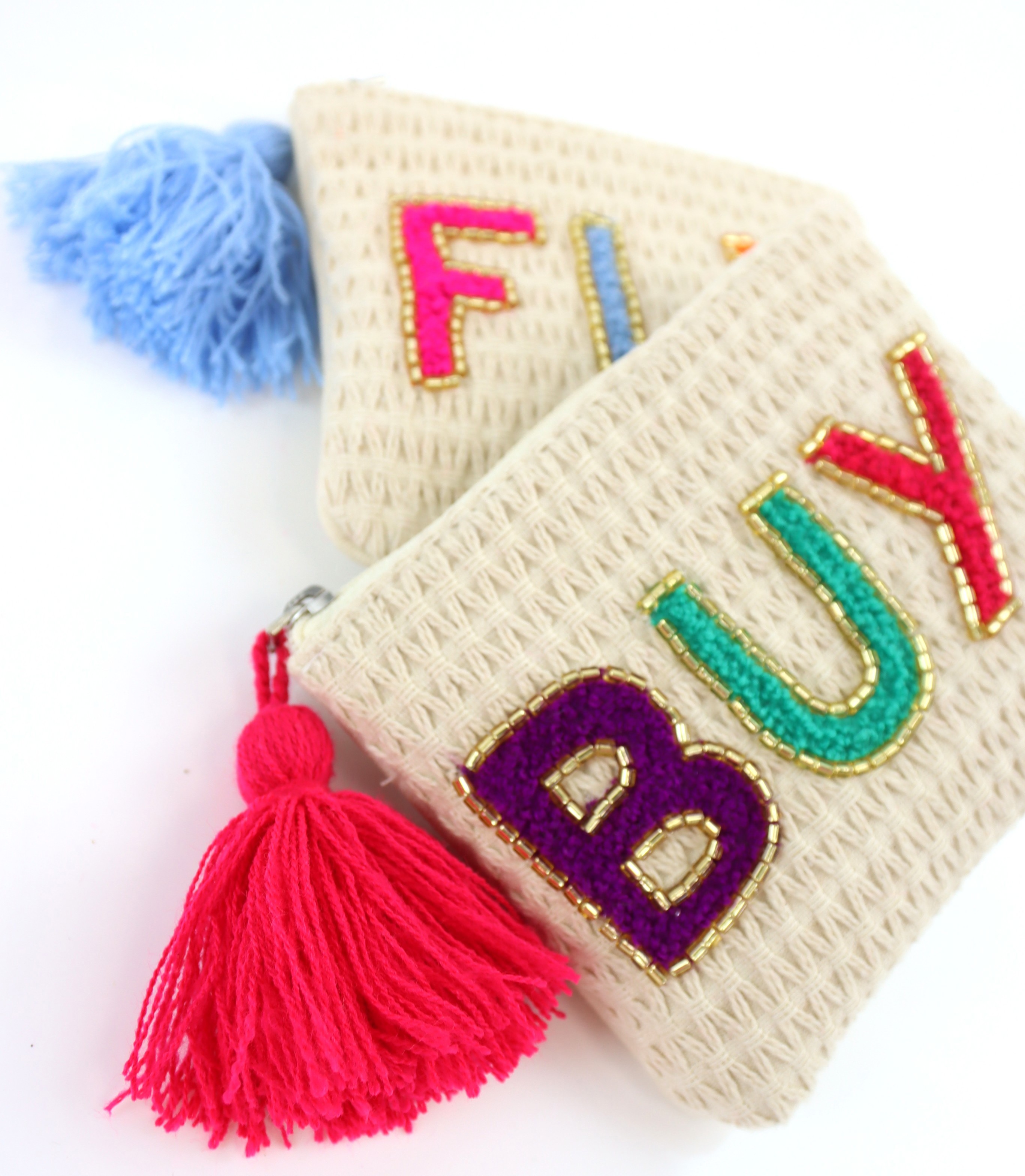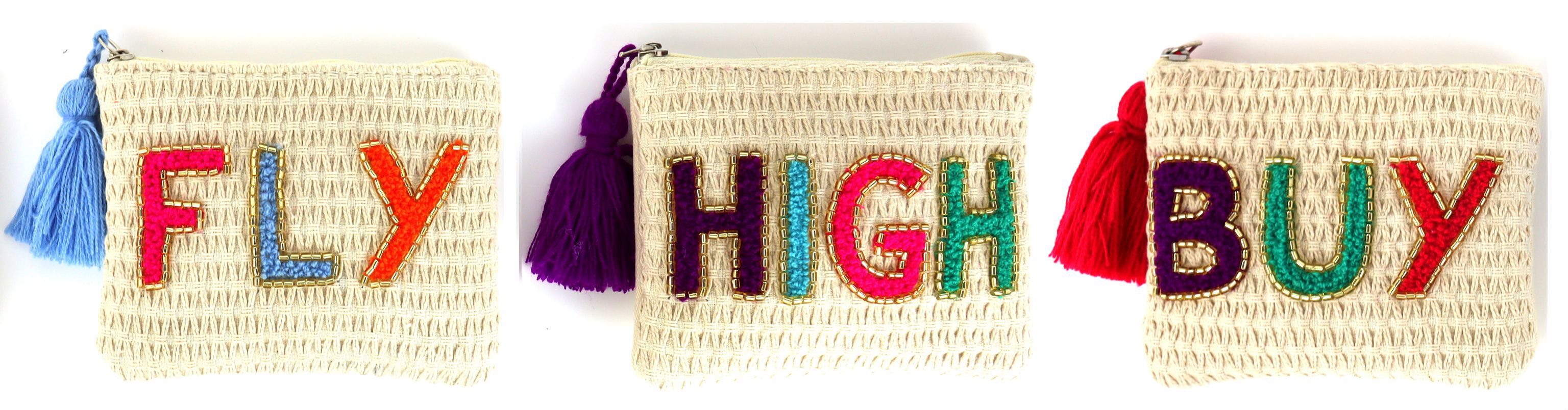 - **Trendiges Design:** Modernes Täschchenset mit inspirierenden Schriftzügen "Fly", "High", "Buy".