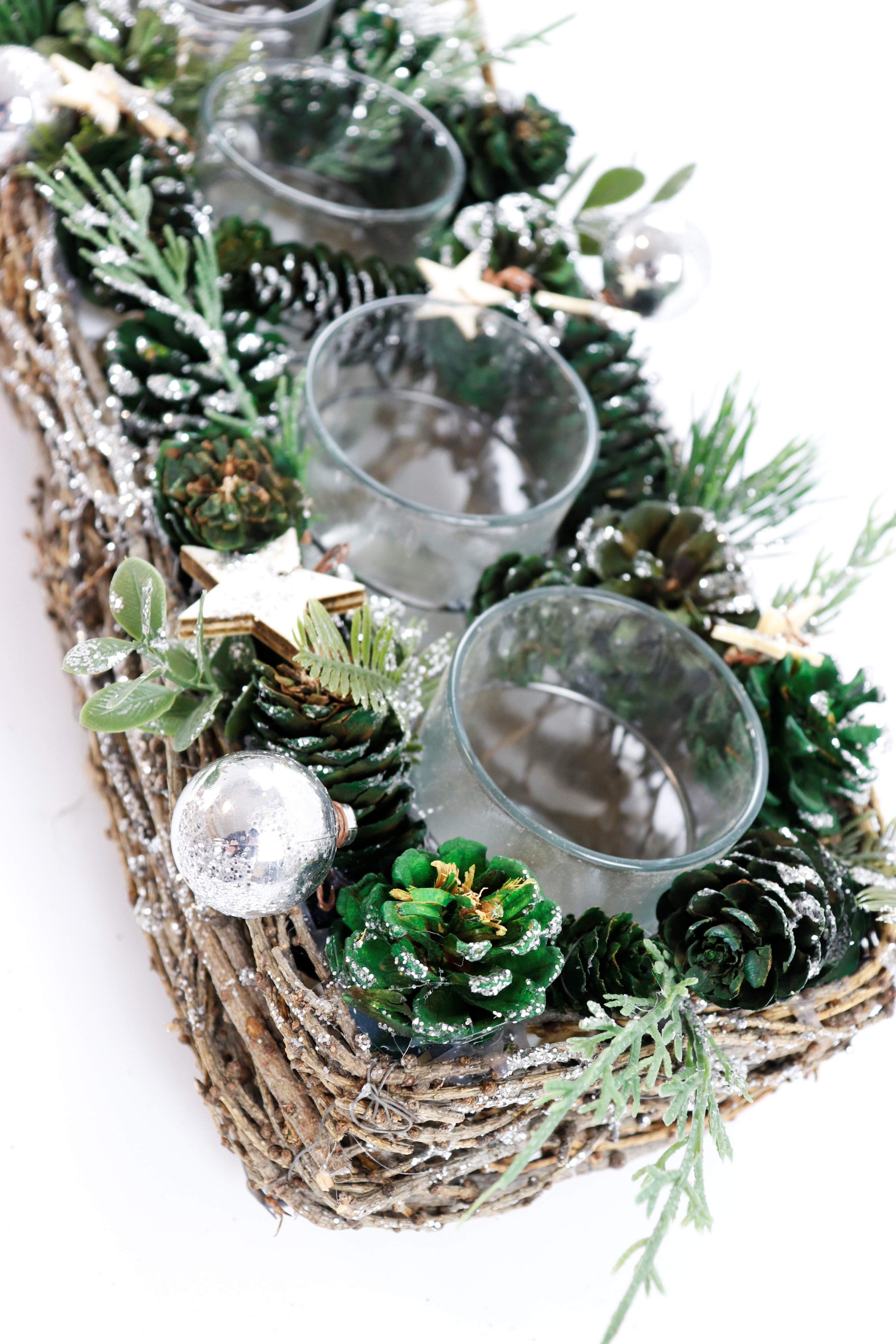 Besondere Highlights sind die vier integrierten Teelichthalter, die für eine warme und einladende Beleuchtung sorgen. Die Zusammensetzung der Materialien verleiht dem Objekt nicht nur Stabilität, sondern auch eine raffinierte Textur, die das Licht auf einzigartige Weise reflektiert. Das Zusammenspiel aus natürlichem Pinienzapfen und eleganter Silberoptik setzt betont luxuriöse Akzente und passt perfekt in jede festliche Dekorationsidee.
