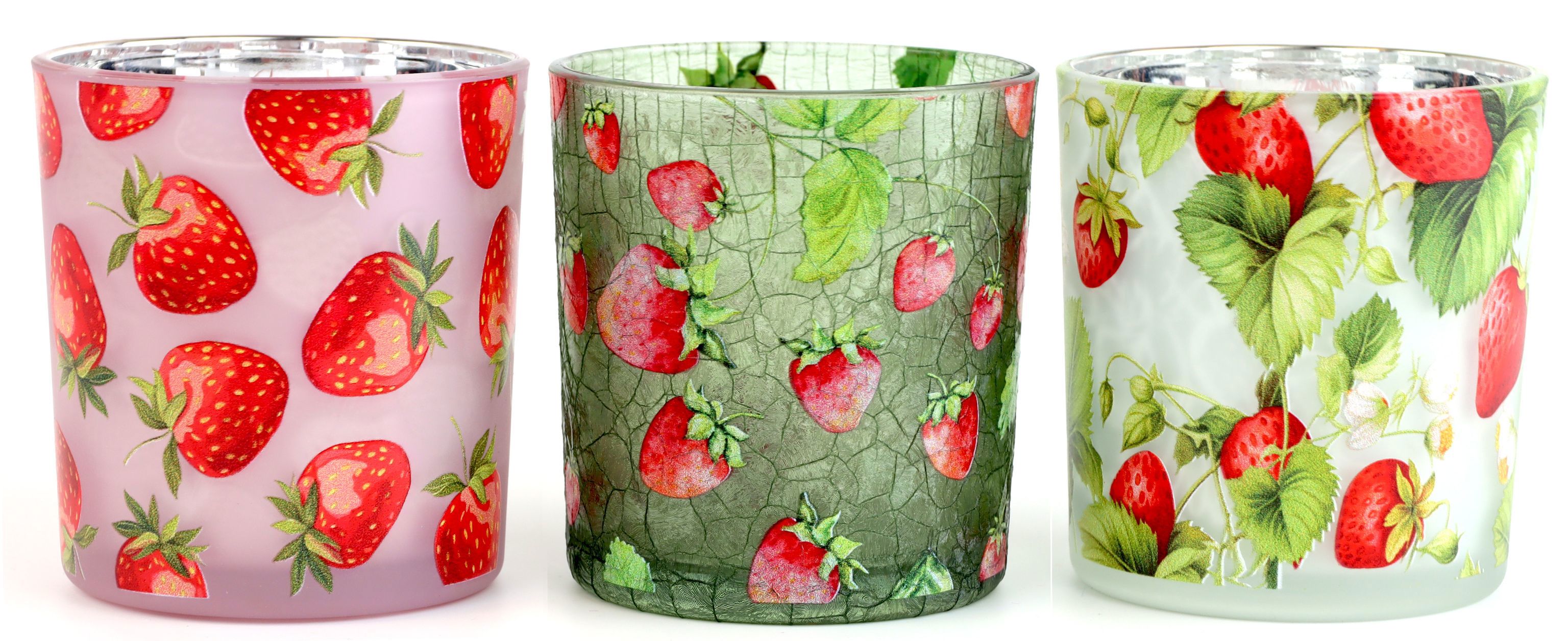 Entdecken Sie unser bezauberndes Windlichter-Set "Strawberry Fields", das die Frische und Unbeschwertheit des Frühlings und Sommers in Ihr Zuhause oder Ihr Ladengeschäft bringt. Dieses exquisite Set besteht aus drei Windlichtern, die aus hochwertigem Glas gefertigt sind und jedes eine Höhe von etwa 8 cm aufweisen. Die stilvollen Motive mit ansprechenden Erdbeer-Designs fangen die Essenz der warmen Jahreszeiten ein und sind somit die perfekte Wahl für alle, die ihren Wohnräumen oder Verkaufsflächen ein frisches und einladendes Flair verleihen möchten.