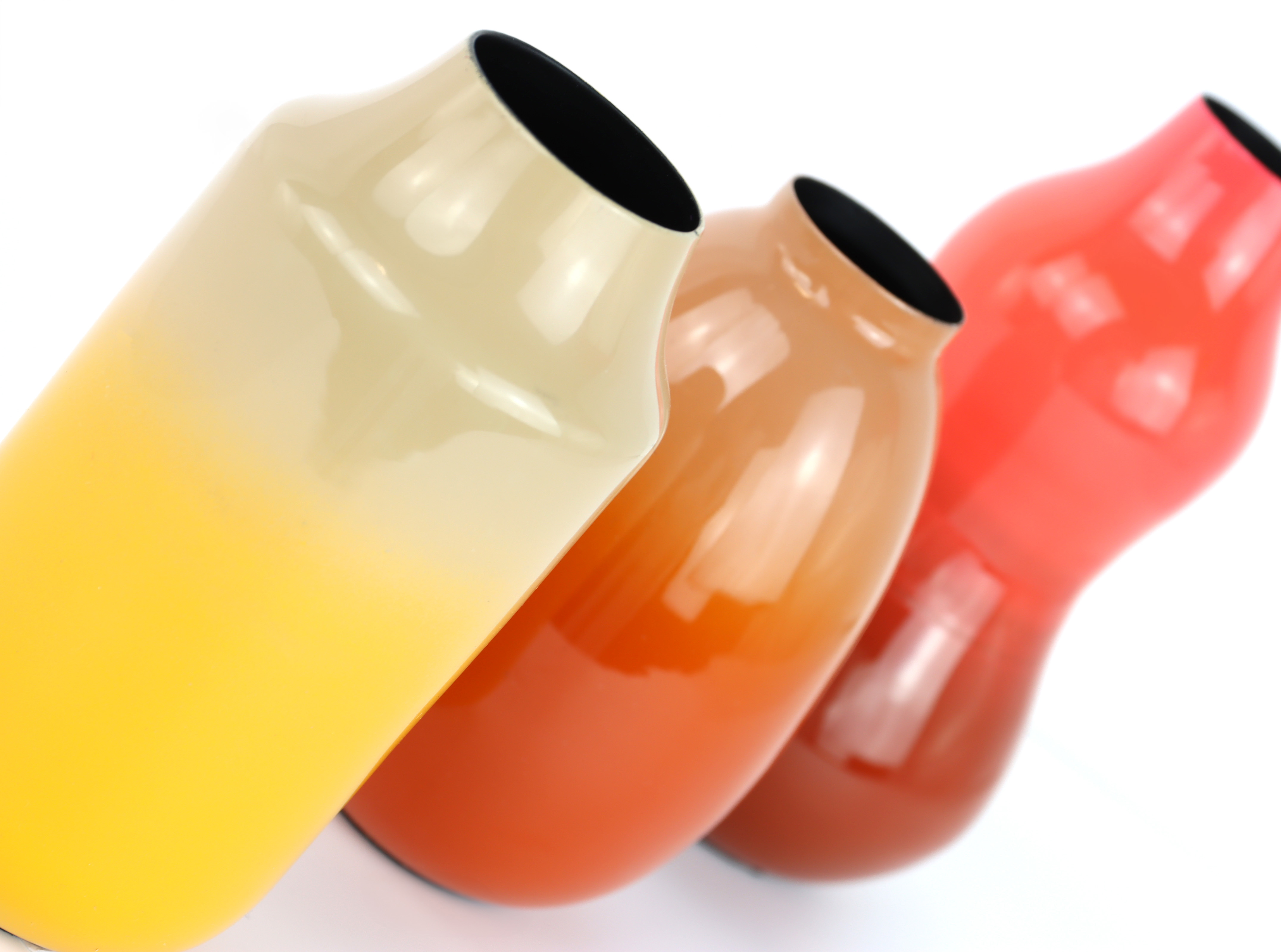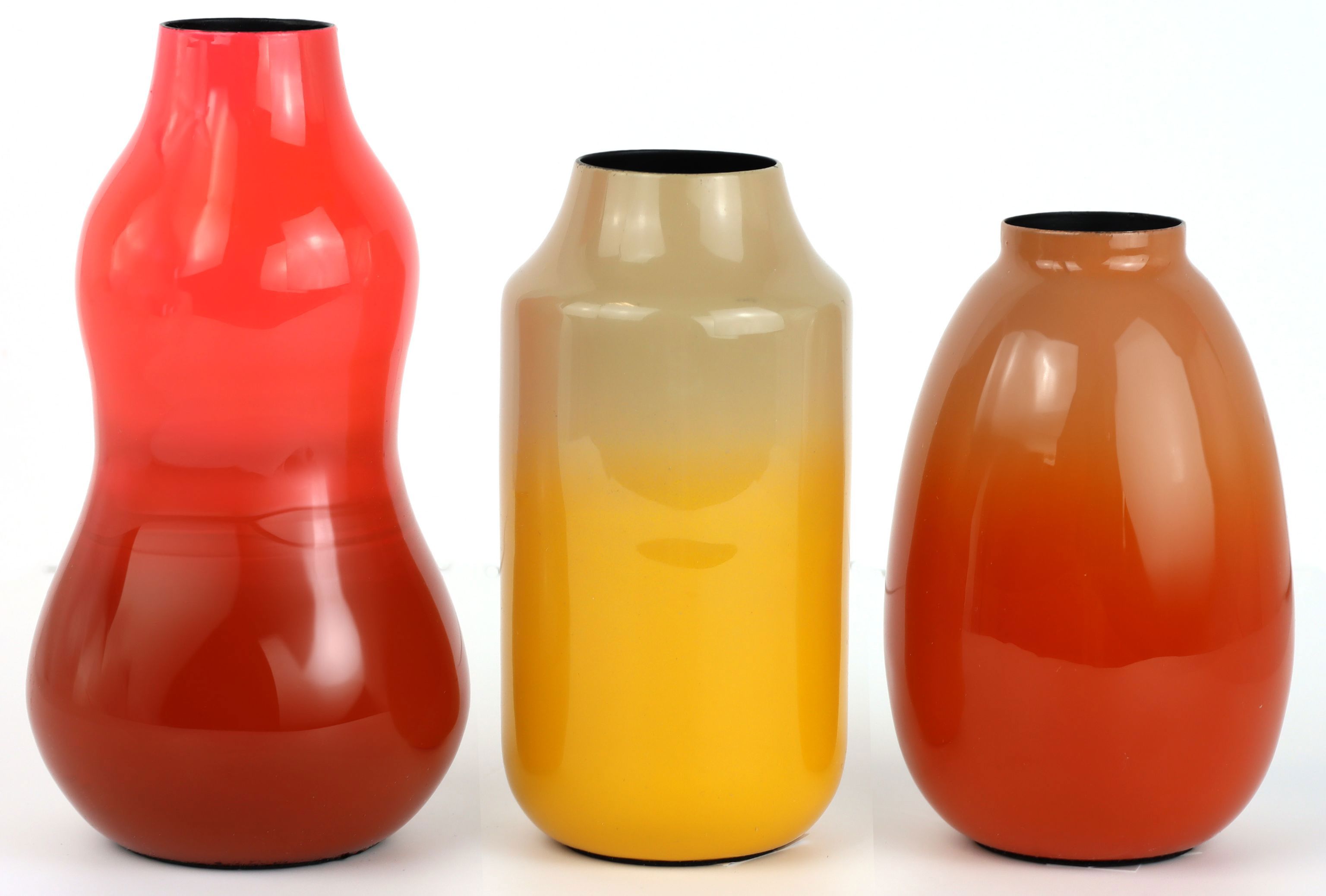 Unser VASENTRIO "AMBER MUSE" S/3 ist ein exquisit gestaltetes Vasenset, das in jedem Raum zum Hingucker wird. Dieses dreiteilige Vasentrio bringt mit seiner kunstvollen Emaillierung in kräftigen Orange-, Rot- und Gelbtönen Wärme und Stil in Ihren Wohnraum. Jede Vase dieser Kollektion ist aus hochwertigem Eisen gefertigt und mit Emaille überzogen, was nicht nur die Farbtiefe verstärkt, sondern den Vasen auch einen bezaubernden Glanz verleiht. Mit einer Höhe von ca. 16 cm eignen sich diese Vasen perfekt für die Präsentation auf einem Sideboard, einem Couchtisch oder einem Fenstersims.