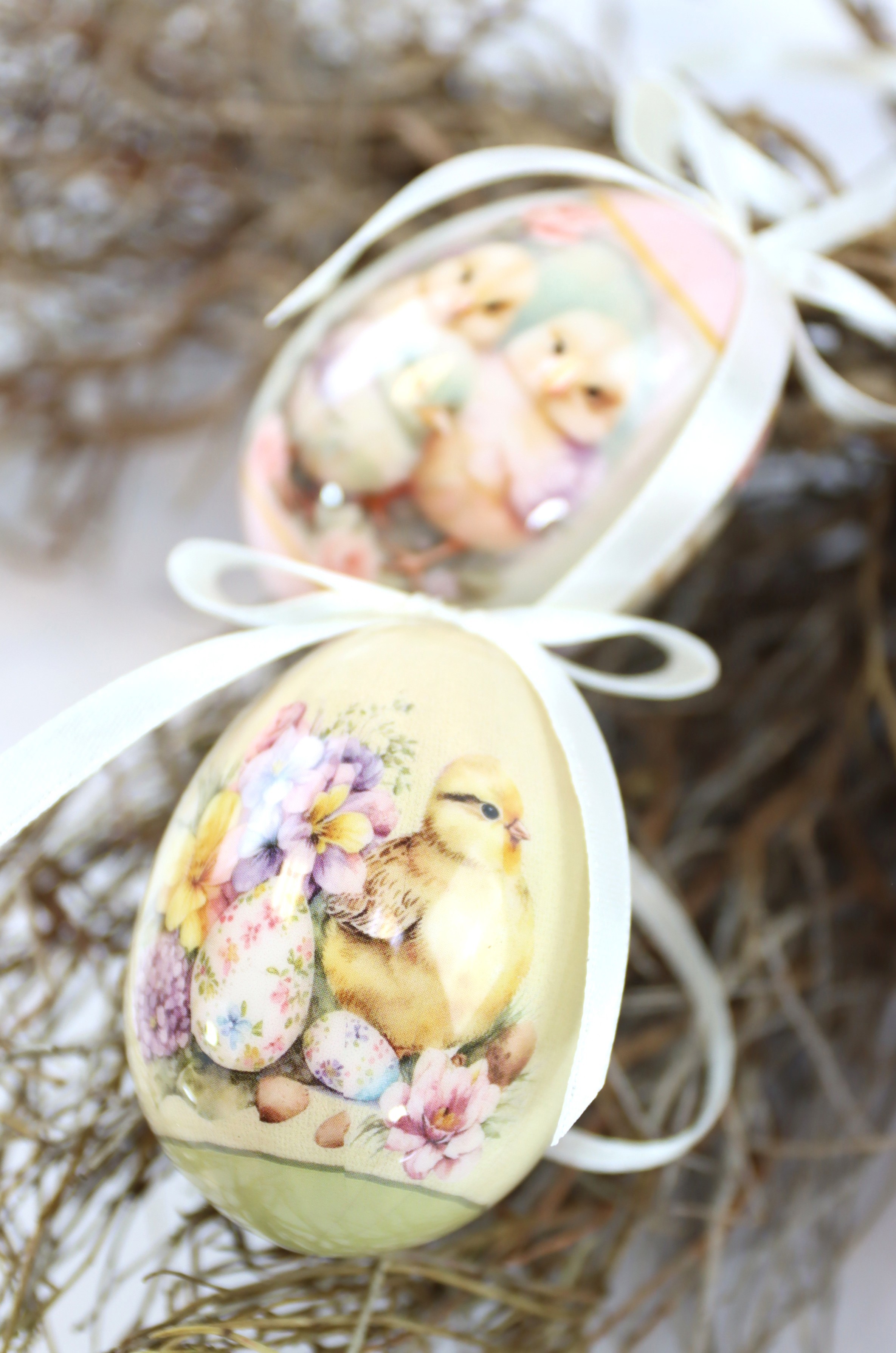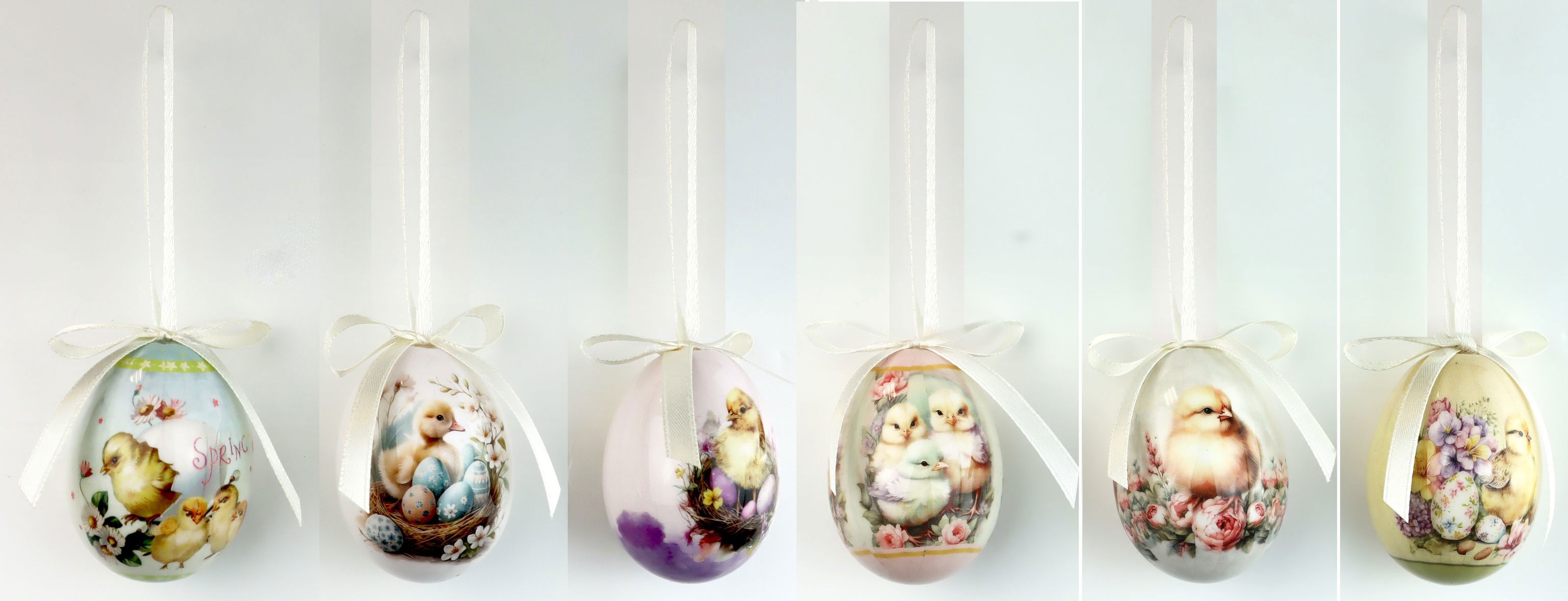 Mit ihrer nostalgischen Optik zaubern die Hängeeier eine warme Atmosphäre, die an vergangene Osterfeiertage erinnert. Die sanftbemalten Oberflächen in subtilen Pastelltönen und mit filigranen Mustern ziehen alle Blicke auf sich und überzeugen durch eine detailreiche Gestaltung. Die Größe von ca. 6 cm ist optimal für verschiedene Dekorationsmöglichkeiten – ob als Hingucker an einem frühlingshaft geschmückten Baum, als stilvolle Tischdekoration oder als charmantes Detail in geschäftlichen Schaufensterdekorationen.