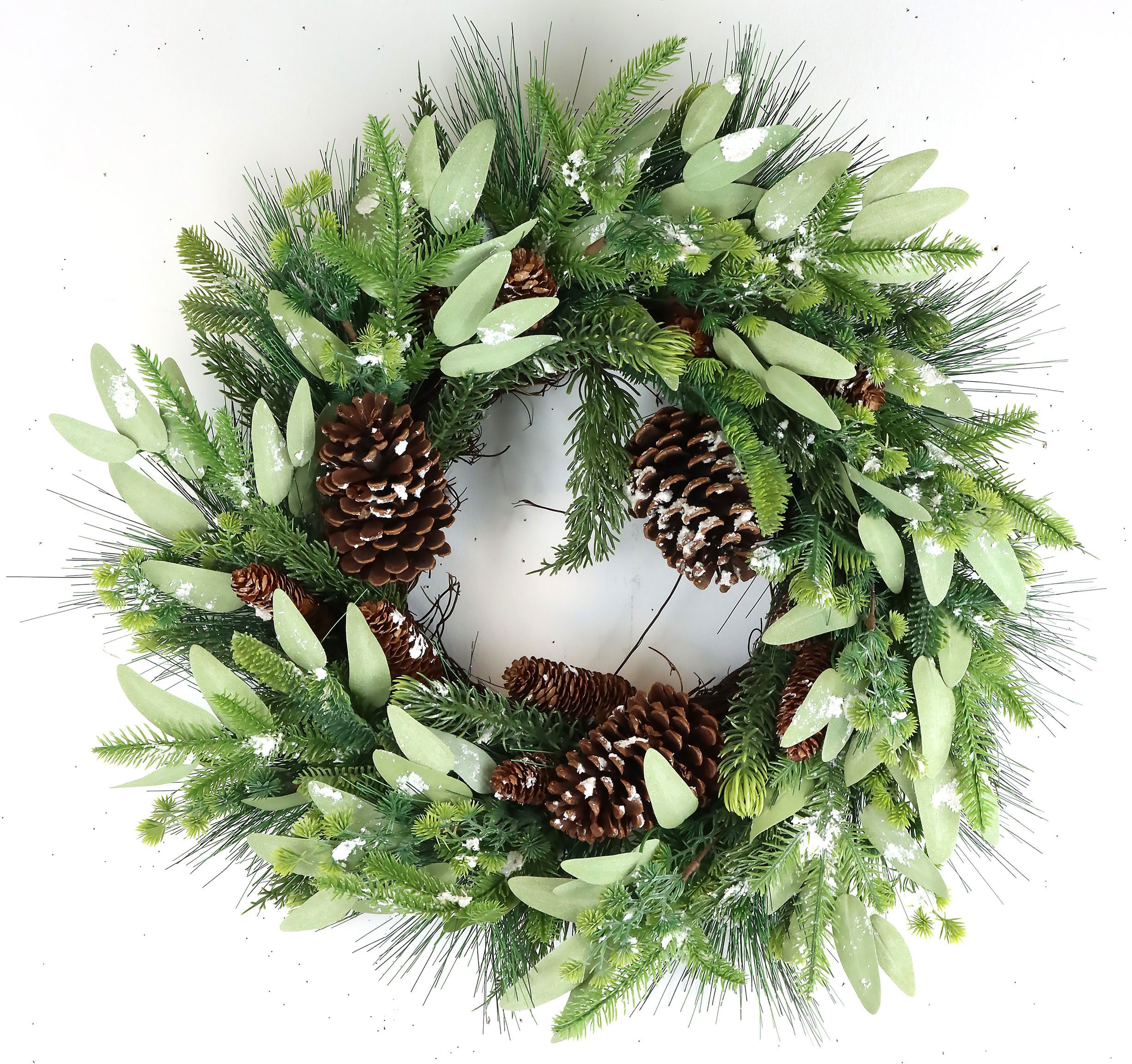 Der Kranz ist kunstvoll mit natürlichen Tannenzapfen verziert, die einen authentischen Charme versprühen und ein winterliches Ambiente zaubern. Jede handgefertigte Komposition sorgt dafür, dass der Kranz natürlich und lebendig aussieht. Dies macht ihn zu einer idealen Ergänzung für die weihnachtliche Dekoration in Schaufenstern, Ladengeschäften oder als atmosphärische Dekoration auf Verkaufstischen und Theken.