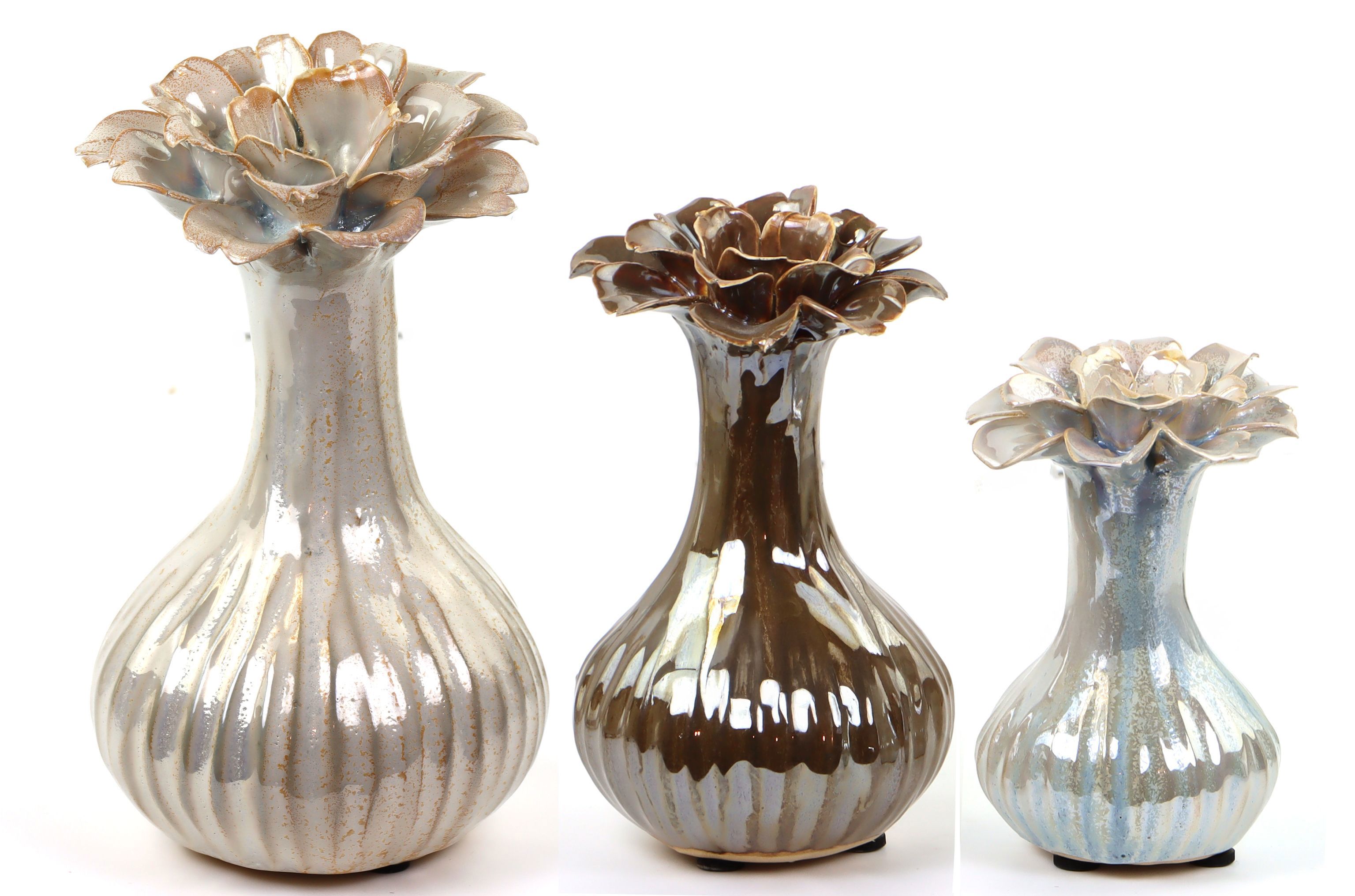 Entdecken Sie unser exklusives 3-teiliges Vasenobjekt-Set "Sienna", das speziell für den anspruchsvollen stationären Einzelhandel im Bereich Wohnen und Lifestyle entwickelt wurde. Dieses einzigartige Set aus Keramik überzeugt durch zeitlose Eleganz und exquisite Handwerkskunst. Die Vasenobjekte kommen in unterschiedlichen Höhen von ca. 21 cm, 17 cm und 13,5 cm und sind in einer stilvollen Kombination aus glänzendem Silber und warmem Braun gehalten. Diese Farbgebung ermöglicht eine harmonische Integration in verschiedene Einrichtungsstile, von modern bis klassisch.