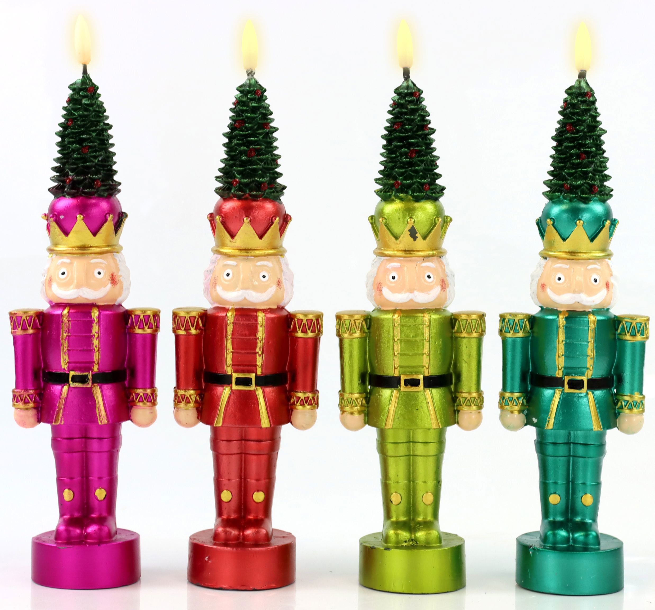- Vierteilige LED-Nussknacker in den festlichen Farben Grün, Rot, Rosa und Blau