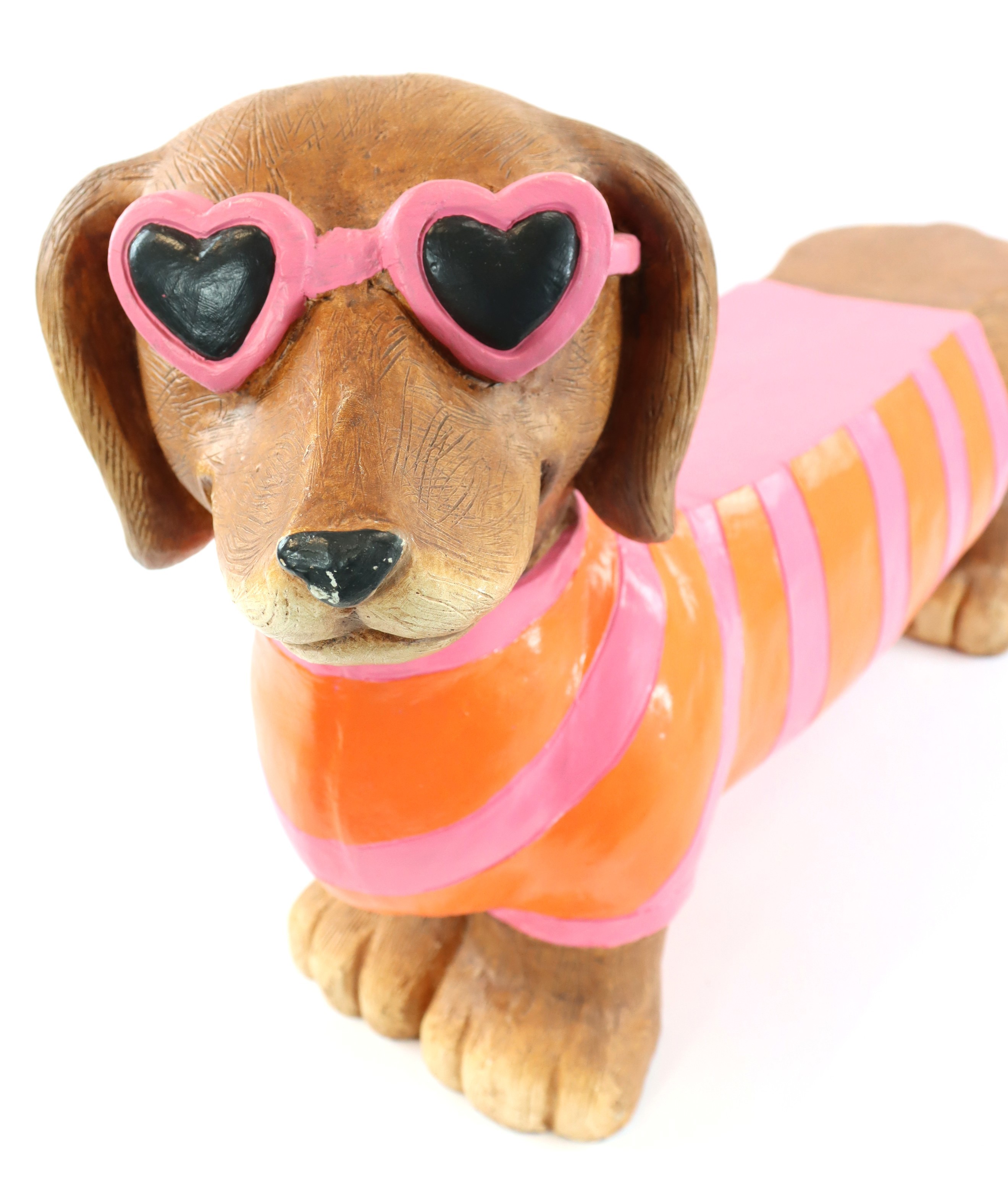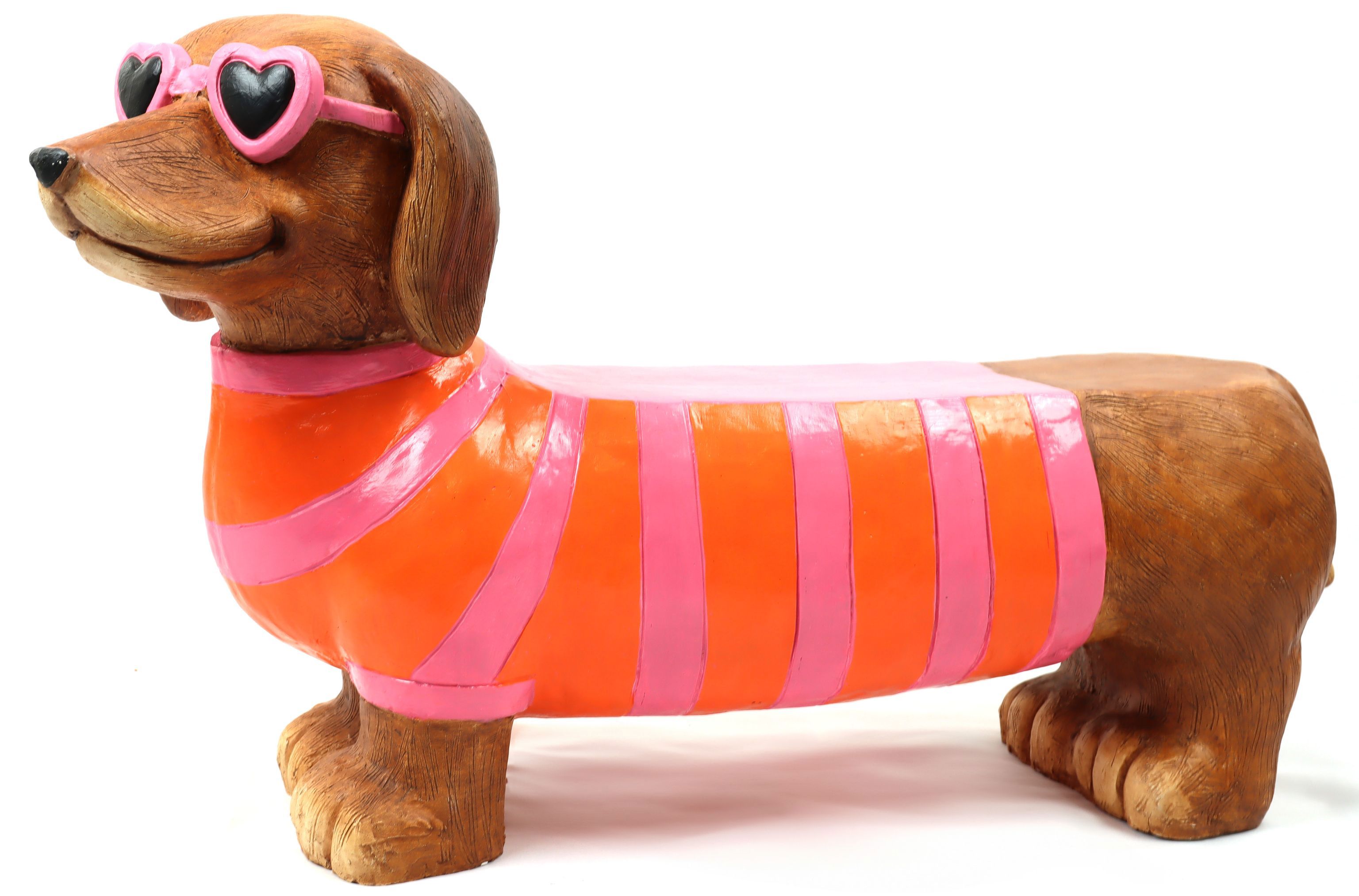 Hergestellt aus langlebiger Magnesia, vereint das Design der HUNDEBANK "DAPPER DOG" Stil und Robustheit. Die Bank zeigt das charmante Motiv eines Dackels, gekleidet in einen modischen orange-rosa gestreiften Pullover, das jedem Raum eine fröhliche und einladende Atmosphäre verleiht. Diese zeitlose und durch natürliche Materialien inspirierte Dekoration ist ideal, um Verkaufsräume und Schaufenster zu beleben und ein Lächeln auf die Gesichter Ihrer Kunden zu zaubern.